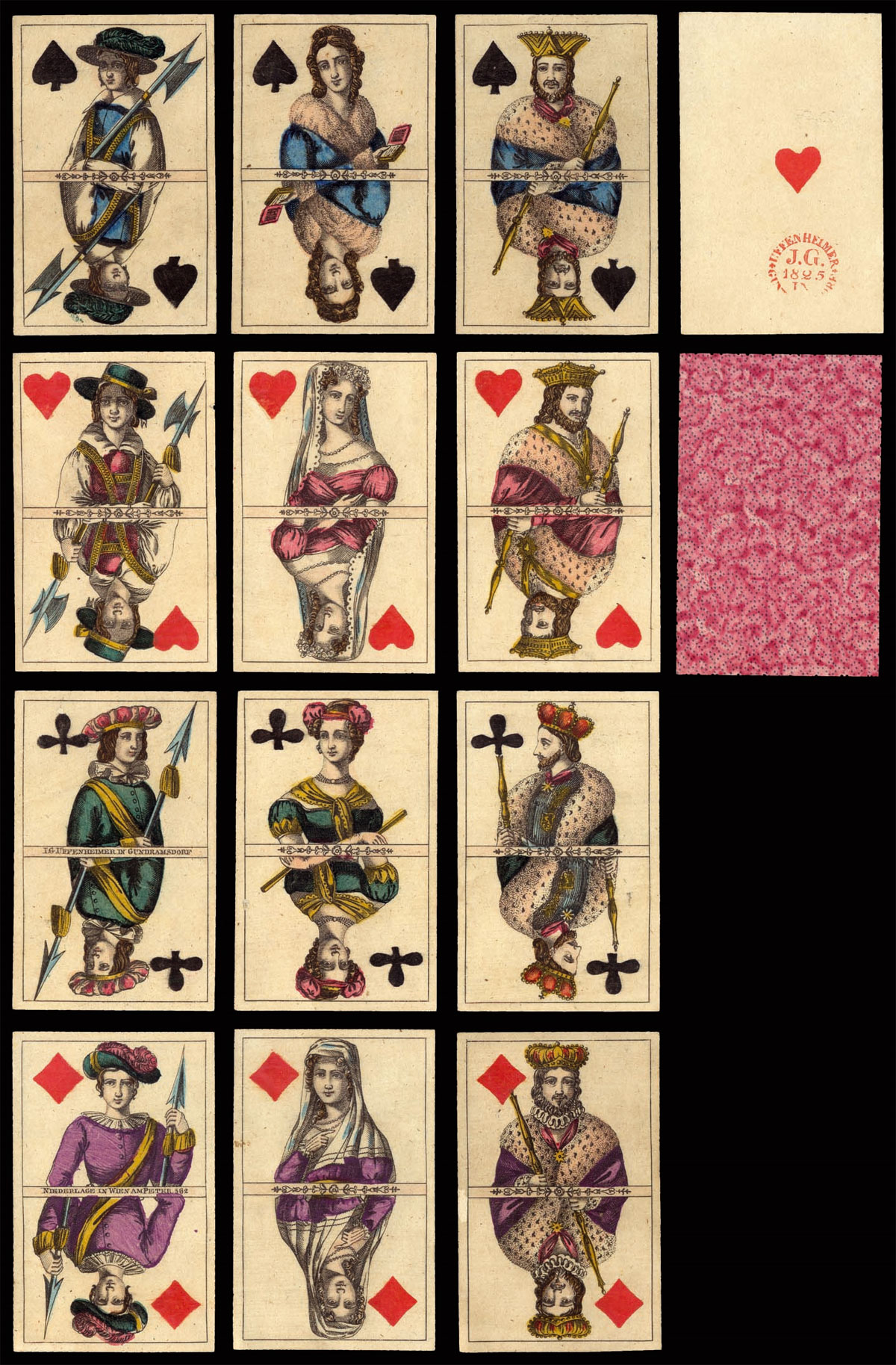 Above: fine non-standard french-suited playing cards produced by Johann Gabriel Uffenheimer, Guntramsdorf, Austria, 1825. Stencil coloured engravings. Images courtesy Alberto Pérez González.