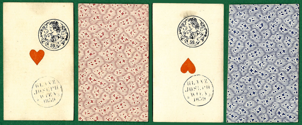 The tax stamp on the aces of hearts with a female portrait was used in Austria-Hungary in the years 1857-1859. In this case, the year of production is also documented by the manufacturer's own stamp, which states the year 1859.