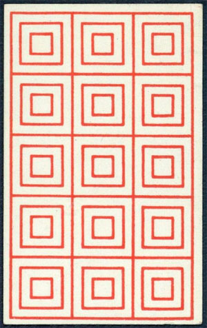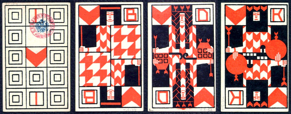 Even before her Jugendstil Tarock, Ditha Moser created a deck of cards for the game of Whist in 1905. It was one of the luxury design products of the Wiener Werkstätte. The great minimalistic red’n’black solution corresponds to the current art trend of the time, which we now refer to as the Vienna Secession¹, especially its geometric lines, the leading representative of which was Josef Hoffmann. See the box prototype