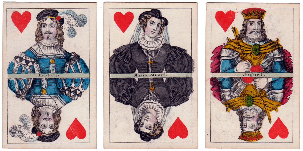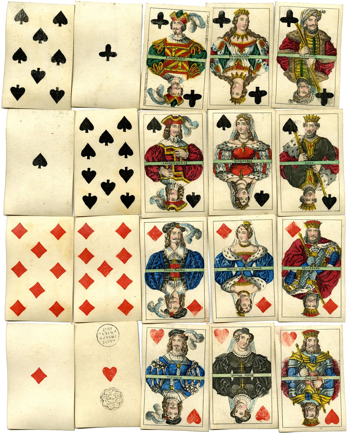 Another slightly earlier example of this fine deck is preserved in the British Museum • number 1896,0501.247. The curator's notes describes the pack as having characters in historical plays on the court cards, Fridolin, Maria Stuart, Jugurd, etc. The ace of hearts bears the duty stamp and that of the maker.