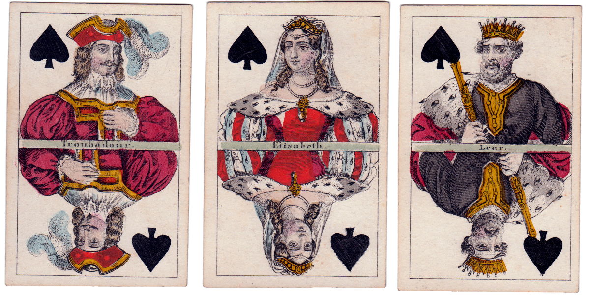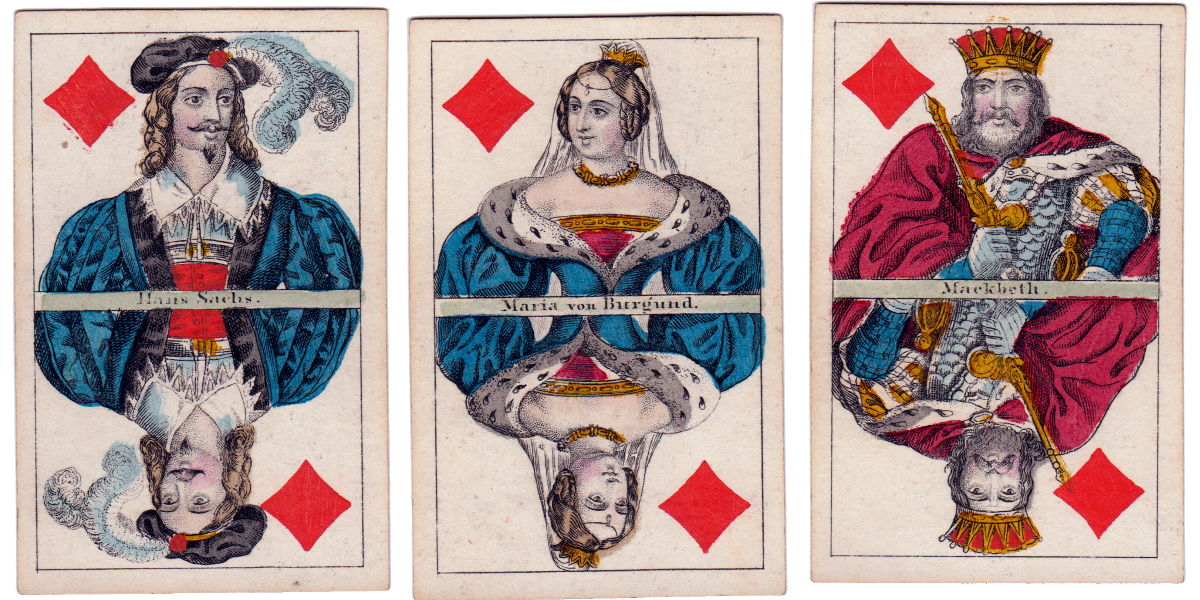 Above: finely engraved Historical Theatrical playing cards first manufactured by Joseph Glanz, Vienna, c.1860. The tax stamp on the Ace of Hearts was used between c.1859-1877. Images courtesy Rex Pitts.