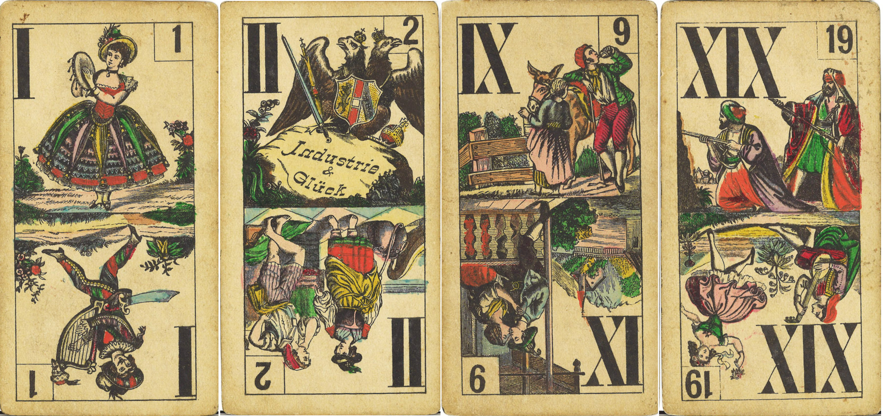 Cards from a 54-card "Austrian Tarock" or "Industrie und Glück Tarock" pack made by Franz Adametz of...