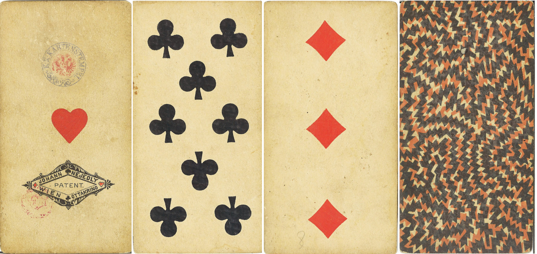 Johann Nejedly, a card manufacturer, is documented in the formerly independent village of Ottakring, which has been part of Vienna since 1892. The surname Nejedly suggests Czech origins, as “Nejedlý” translates to “inedible” in English. In 1862, Johann Nejedly obtained a license to produce cards, with the last known pack dating from 1896. The company offered a wide range of products and underwent dynamic technological development typical of the second half of the 19th century. Among the common products of this period are tarock cards of the “Industrie und Glück” type, which exhibit several distinctive features that set them apart from typical productions of the time.