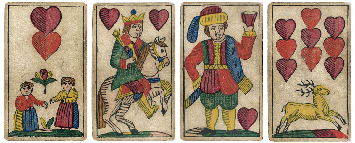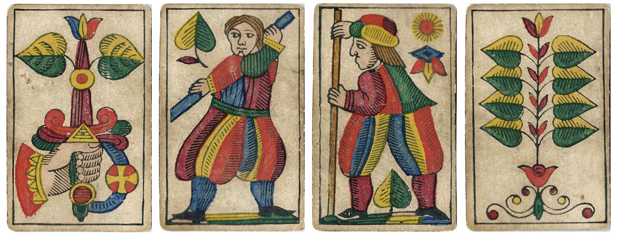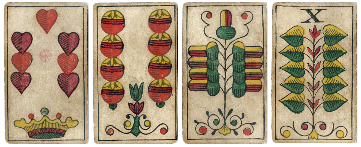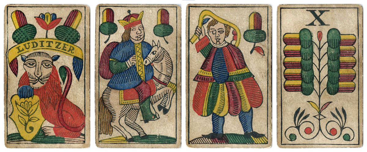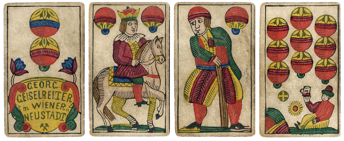 Above: Luditz pattern playing cards with German suit symbols by Georg Geiselreiter, Wiener Neustadt, 1881. 32 cards.