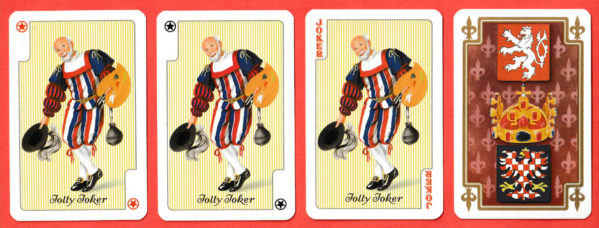 In the 1990s, Piatnik extended their range of packs featuring historical characters from different European countries and regions – Scotland, Bavaria, Hungary, Ireland, Poland, Romania, Spain, Sweden, etc. This one features historical figures from Bohemia and Moravia (roughly equivalent in area to the modern-day Czech Republic) on the double-ended court cards, including Jan Hus, the religious reformer. The back design includes the arms of both Bohemia and Moravia set against either a red or a blue background. Piatnik No. 2554. See the box►