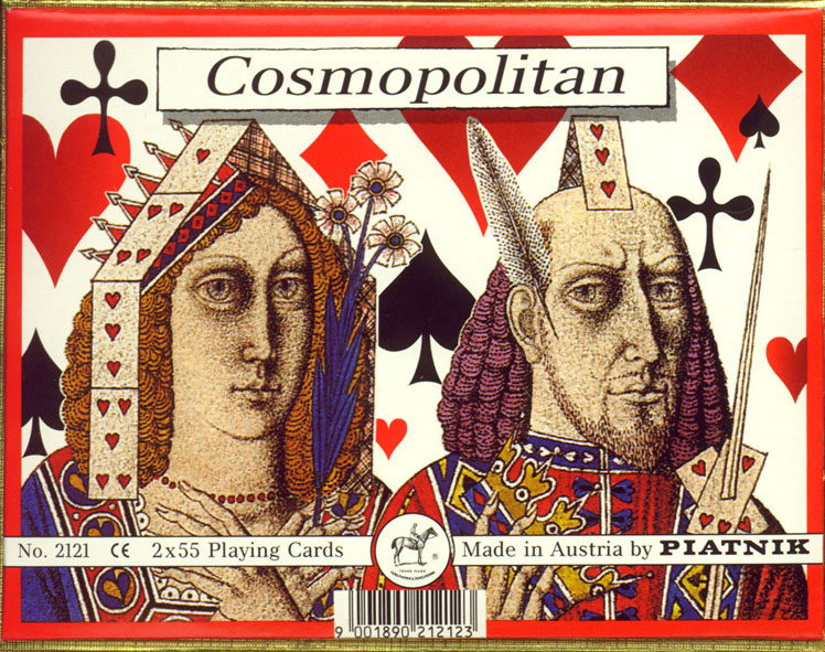 Cosmopolitan № 2121 playing cards were designed by Russian graphic artist Valeri Mishin from St. Petersburg and published by Piatnik in 1996. The imagery presents something of the artist’s allegorical dreamworld, or alternative reality, as open political comment had been muted for some time in Russia. See the Box►
