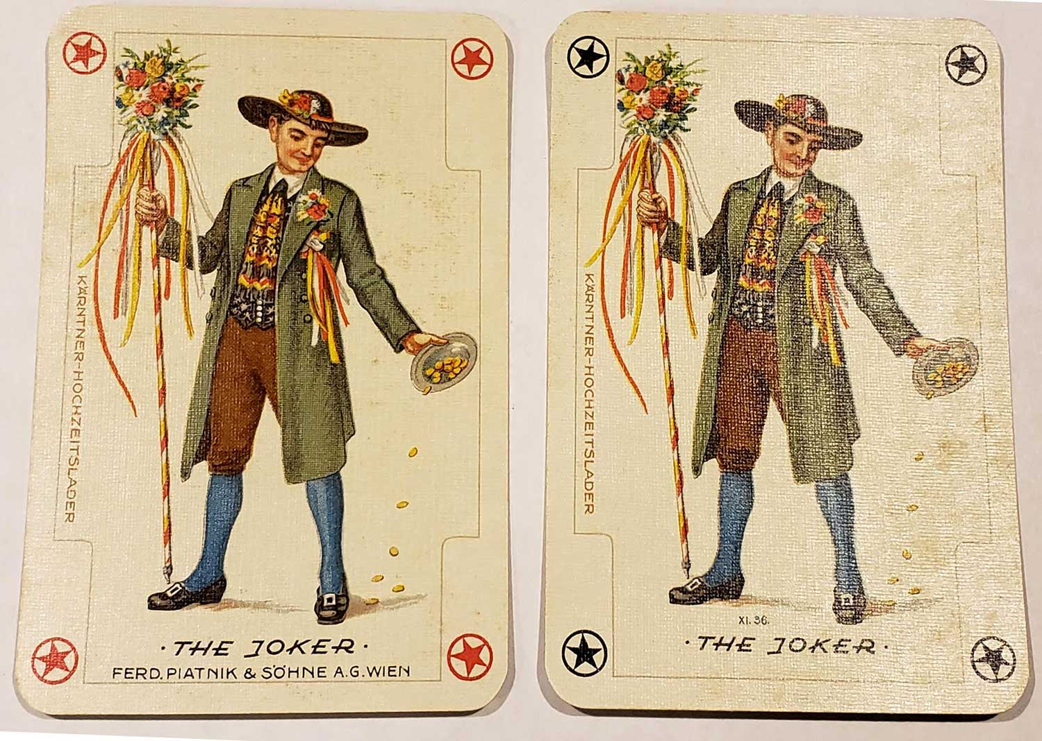 Above: Folklore No.2169 dual bridge deck by Piatnik, Vienna, 1979. The 3 jokers depict a Carinthian Wedding Inviter (Kärntner Hochzeitslader). Images courtesy Matt Probert.
