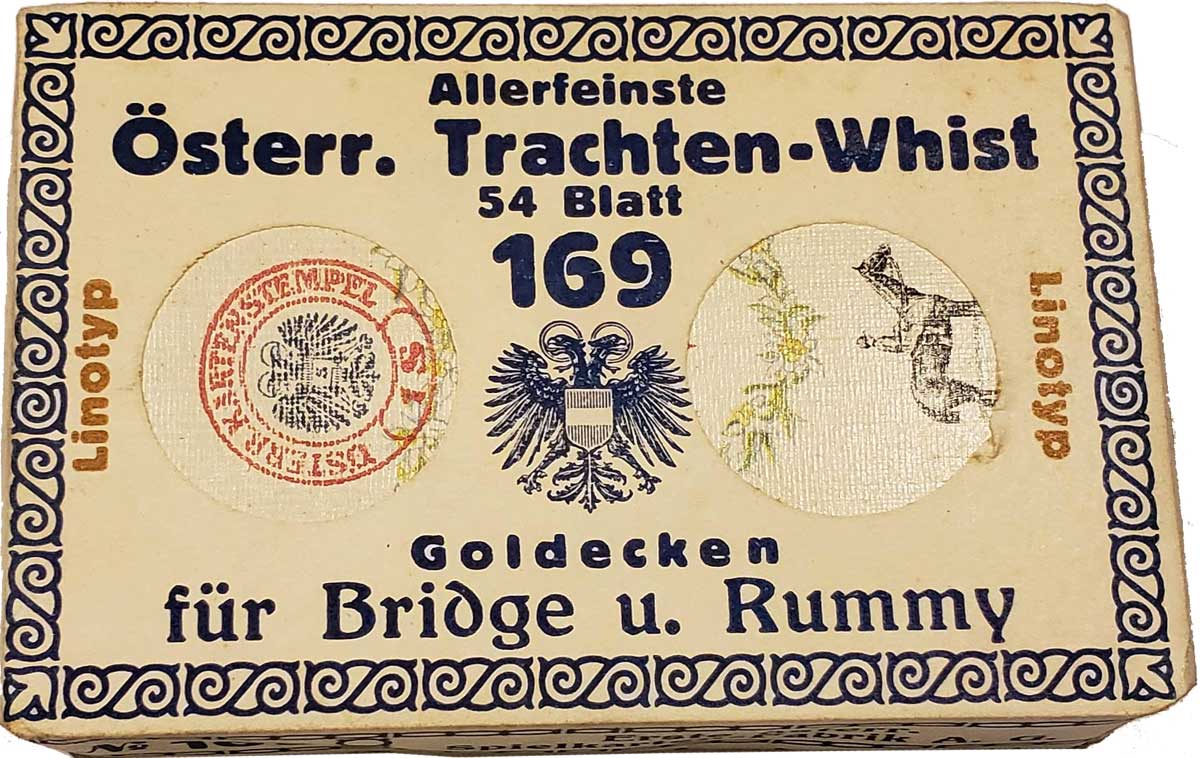 Piatnik first started producing a non-standard “Folklore No.169” deck in c.1934 and the example shown here was published within a year or two of that date. The court cards depict traditional costumes from Austria’s states: Salzburg • Burgenland • Zillertal • Linz • Tirol-Otztal • Salzburg-Lungau • Steiermark • Vorarlber • Wachau • Kärnten-Rosental. The 4 aces and backs are decorated with flowers. See the 1 Schilling outer wrapper►