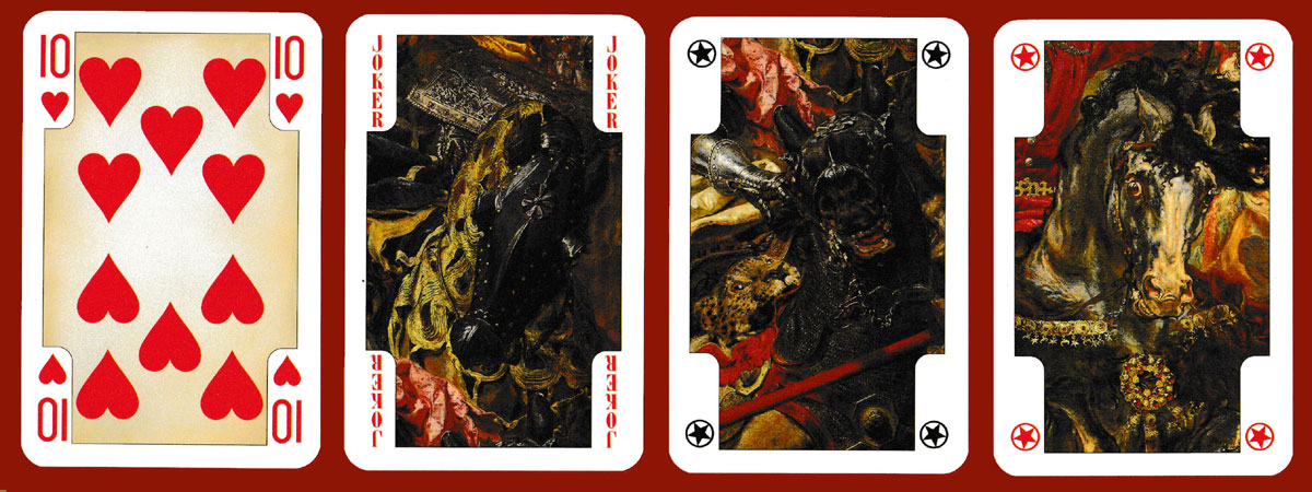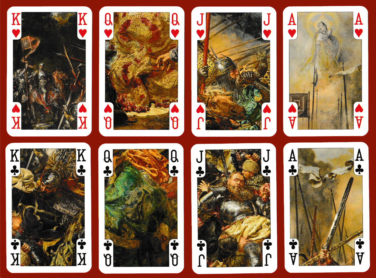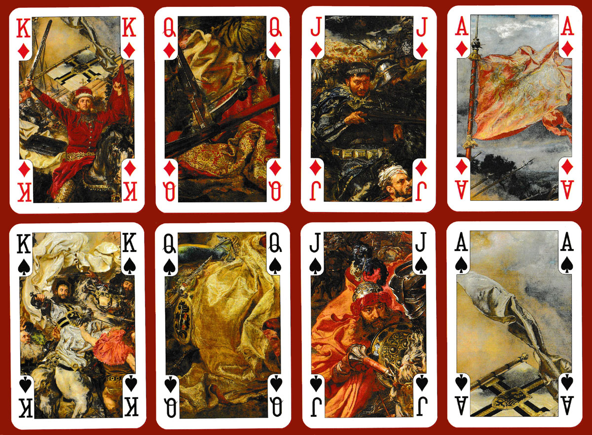 The Battle of Grunwald, or First Battle of Tannenberg, was fought on 15th July 1410 during the Polish-Lithuanian-Teutonic War and was one of the largest in medieval Europe. Featured on the court cards, aces, Jokers and two backs of these cards are details from a monumental painting of the battle executed by the Polish painter Jan Matejko in 1878 (now in the National Museum in Warsaw). One can discern the death scene of the Grand Master of the Teutonic Order, Ulrich von Jungingen (JC), and the Lithuanian grand duke Vytautas the Great, dressed in red with a raised sword (KD). Regarded as a national treasure, the painting was hidden by Poles during the occupation of Poland in World War Two. Piatnik ref. no. 266645. See the box