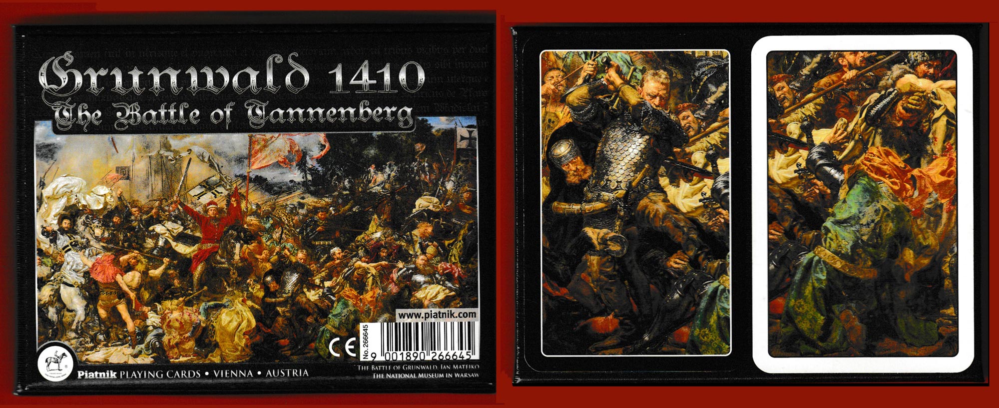 Above: Grunwald 1410 – The Battle of Tannenberg playing cards printed and published by Piatnik, Vienna, Austria, 2010. 2 x 52 cards + 3 Jokers in double drop-lid box. Size: 58.5 x 89 mm.