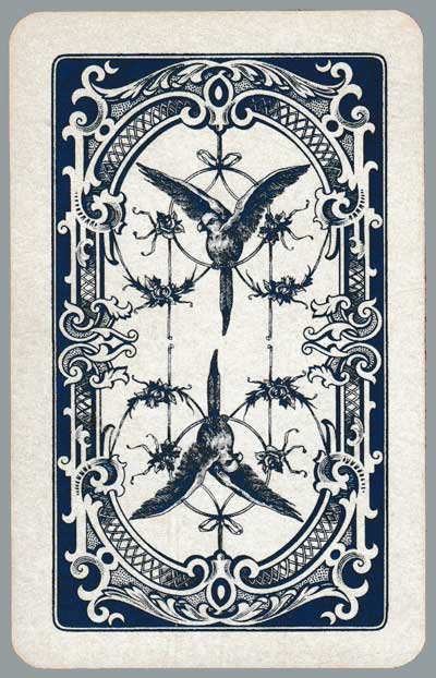 What is curious is that, when one opens a modern pack from Piatnik, one finds that the card designs are in exactly the same order as in the older pack. This suggests that the layout of the designs on the sheet prior to cutting is exactly the same as it was when the older pack was being produced. The back design in dark blue – brown in a modern pack – features two birds with outstretched wings. The booklet is in German only, whereas in a modern pack it is in German, English and French. The tuck box gives the appearance of being older than Jensen¹ suggests. See the box & booklet►