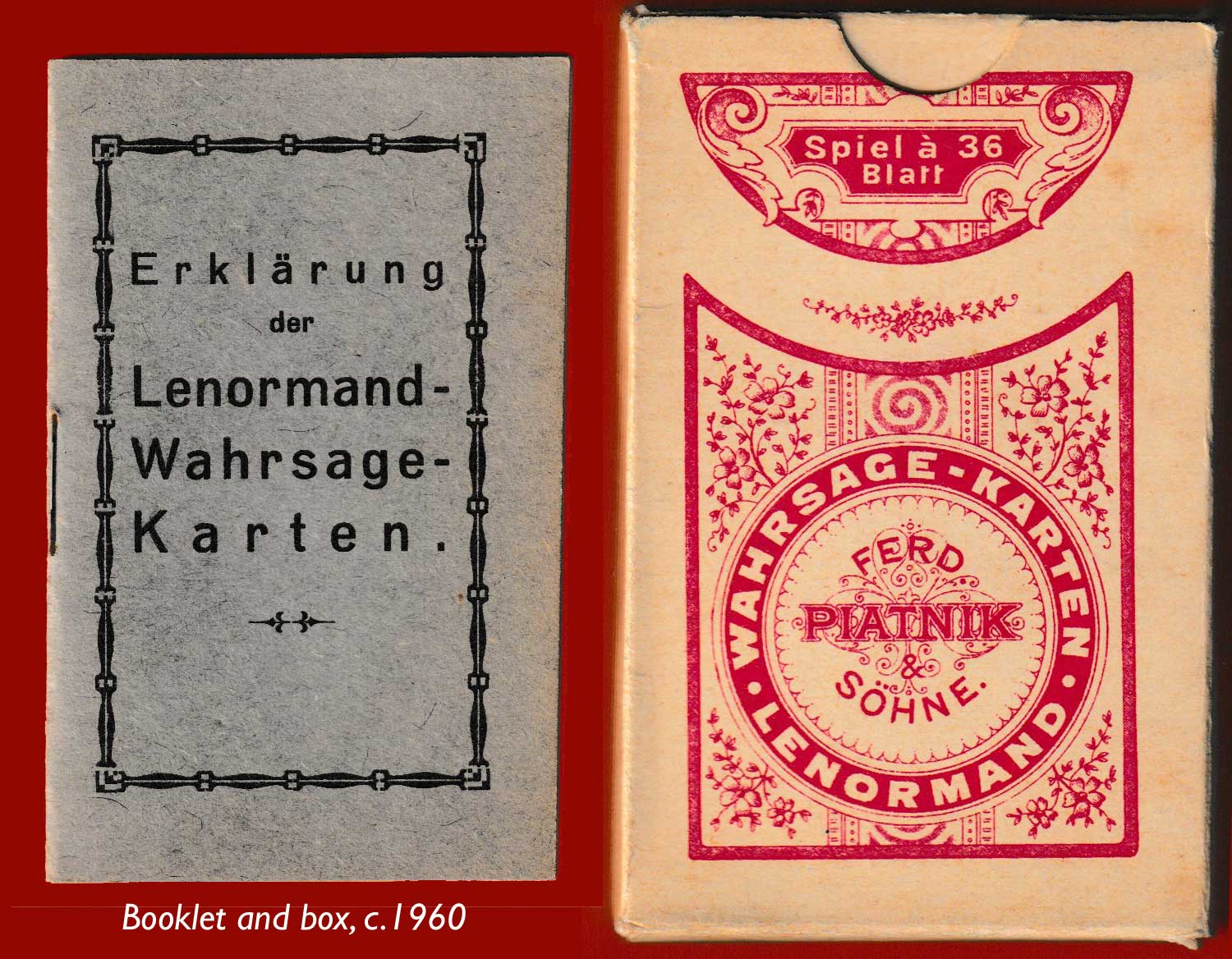 Above: Lenormand Wahrsage-Karten No. 55 made by Ferd. Piatnik & Söhne, Vienna, Austria, c1960. 36 cards + 16-page booklet in German, in tuck box. Size: 57 x 89.5 mm. The number 55 appears on the sides of the box and the back design is reproduced (in red) on the back of the box.