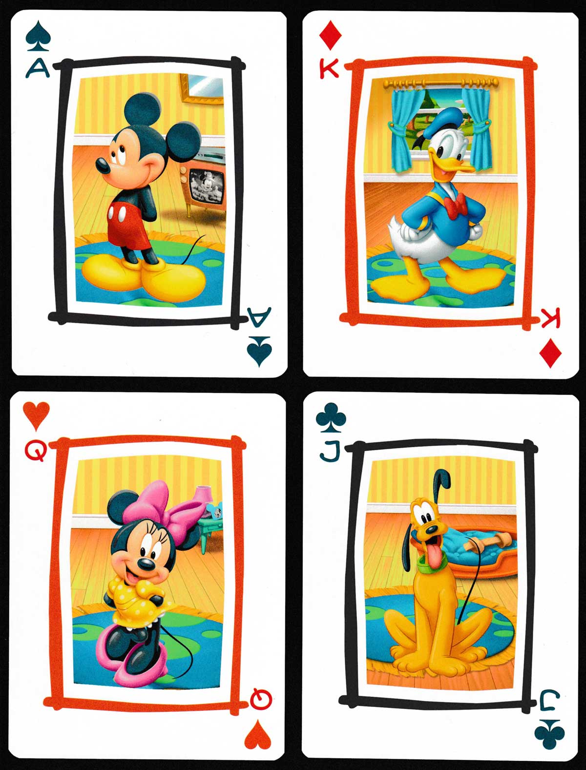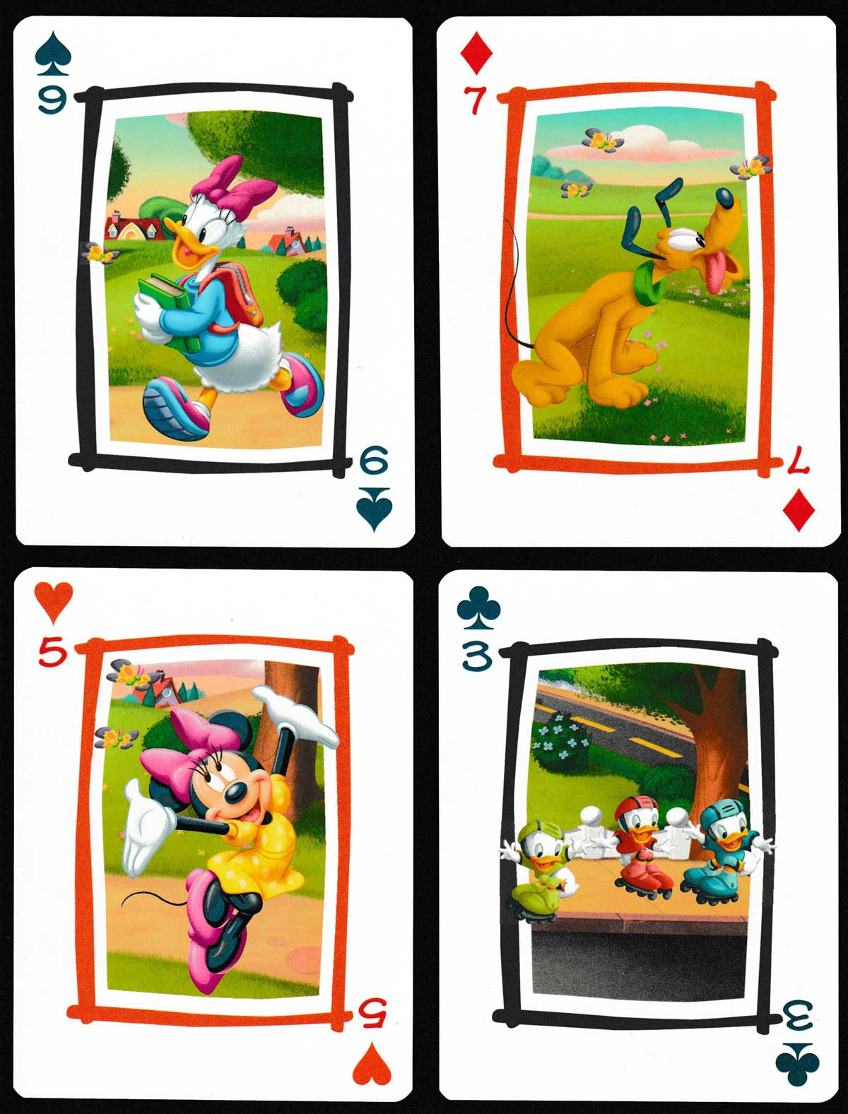 Under the terms of the licensing agreement, this pack was made by Piatnik specifically for the Hungarian and Czech markets. The 13 different images of Mickey Mouse, Donald Duck, Minnie Mouse, Pluto, etc., are repeated on the same card in each suit, with a fourteenth on the Joker. Each is set within an uneven frame with curved edges. See the box►