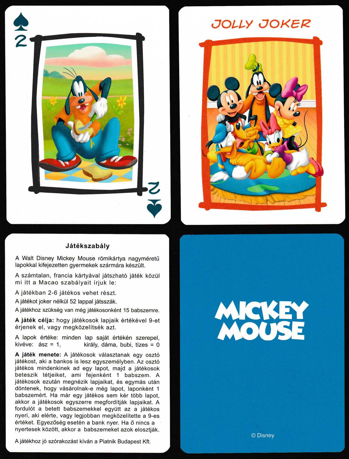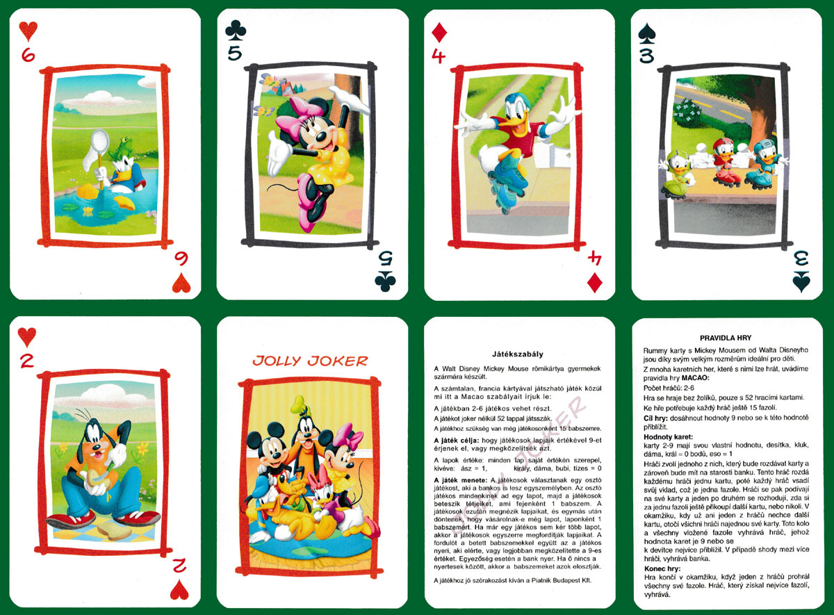 Above: Mickey Mouse Rummy (small) made by Piatnik, Vienna, Austria, for Piatnik Budapest and Piatnik Praha, c2009. 52 cards + 1 Joker + 2 extra cards (one of which can be used as an extra Joker) with text in Hungarian and Czech, in tuck box. Size: 58.5 x 88.5 mm. © Disney.