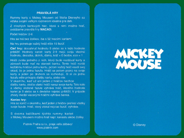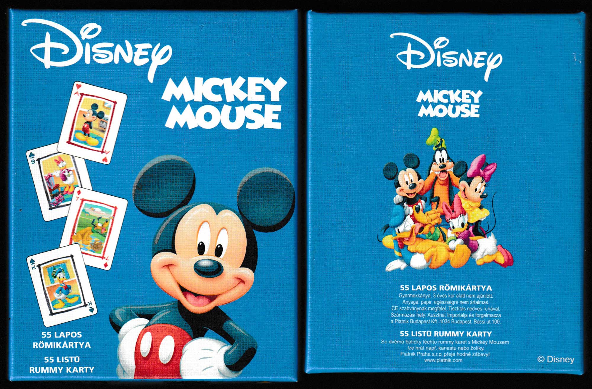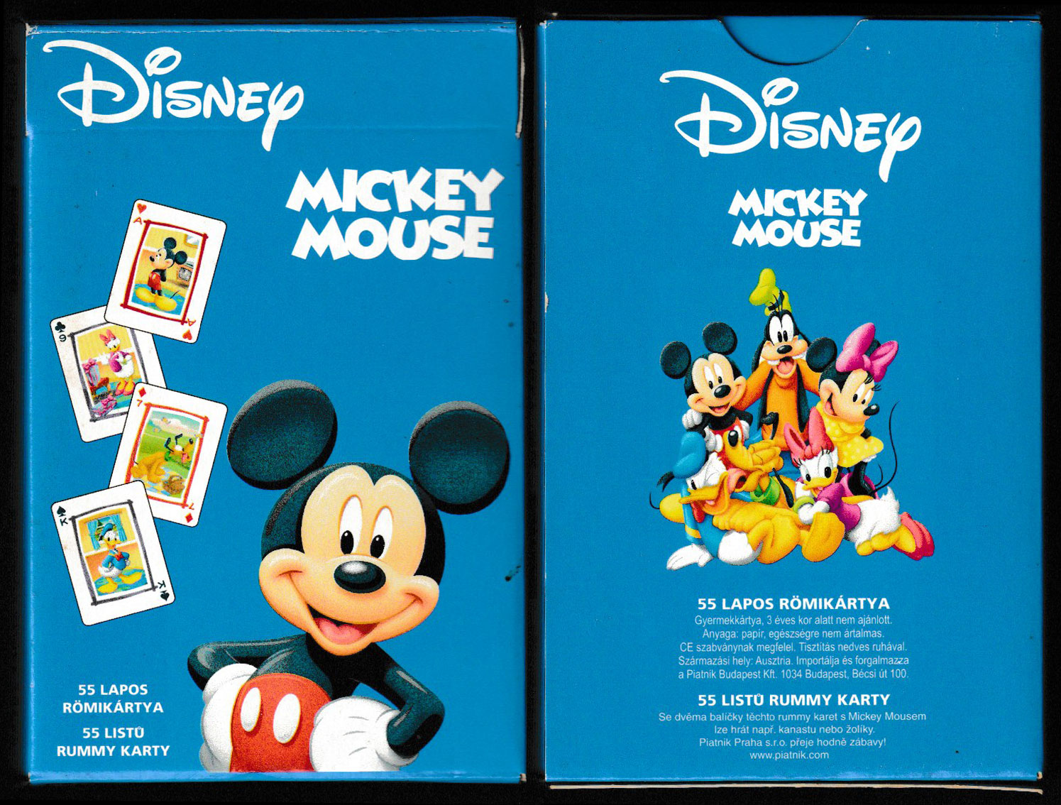 Above: Mickey Mouse Rummy (large) made by Piatnik, Vienna, Austria, for Piatnik Budapest and Piatnik Praha, c2009. 52 cards + 3 (identical) Jokers + 1 (double-sided) extra card with text in Hungarian and Czech, in drop-lid box. Size: 89 x 119 mm. © Disney