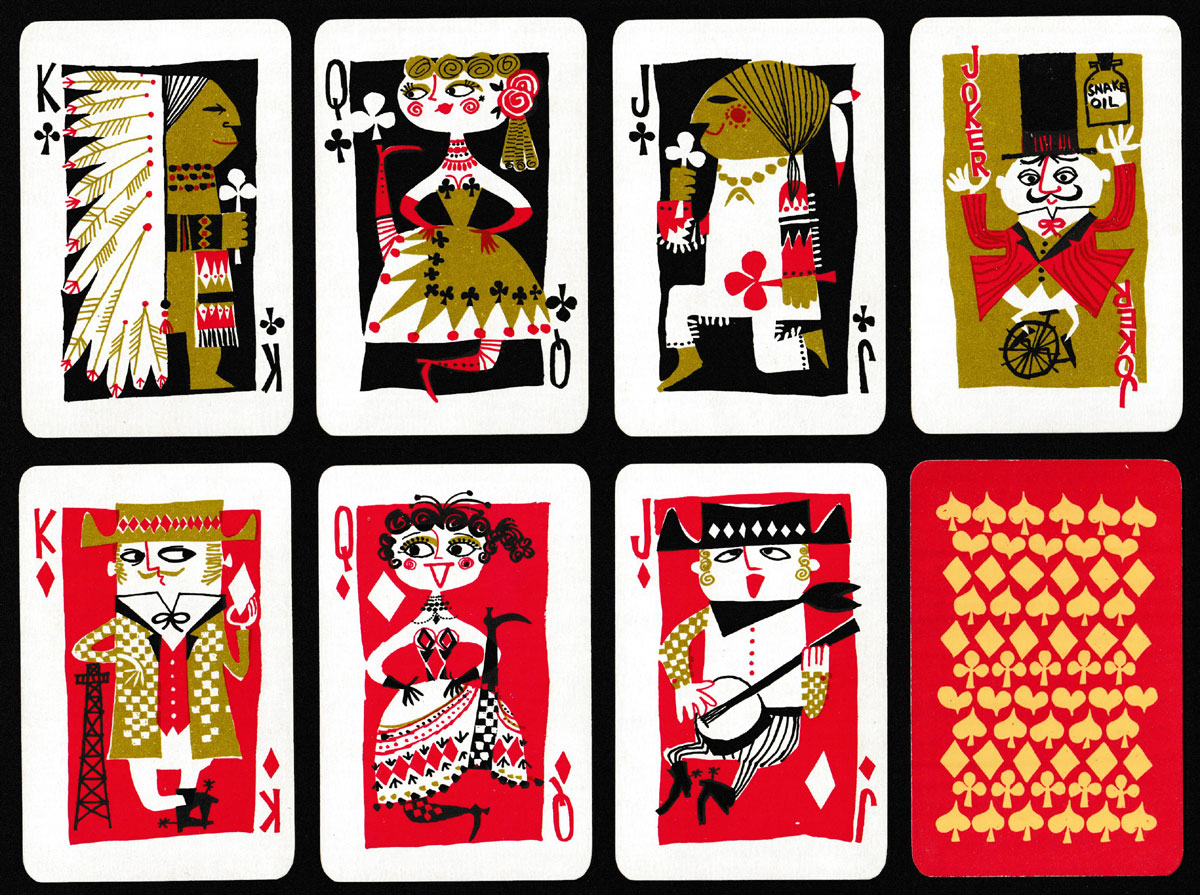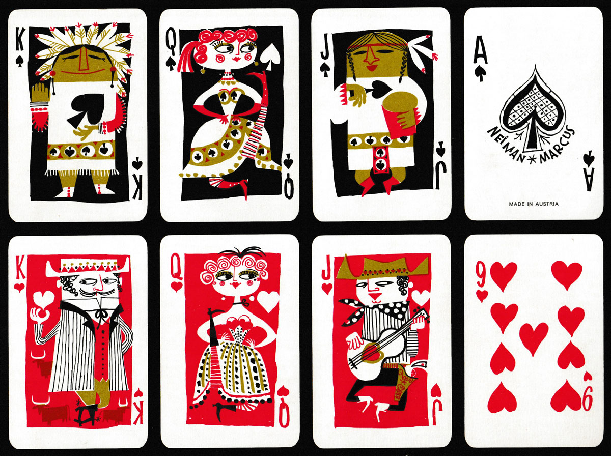 Above: Neiman Marcus playing cards made by Piatnik, Vienna, Austria, for Neiman Marcus, Dallas, USA, c1961. 52 cards + 2 (identical) Jokers. Size: 58 x 89 mm.