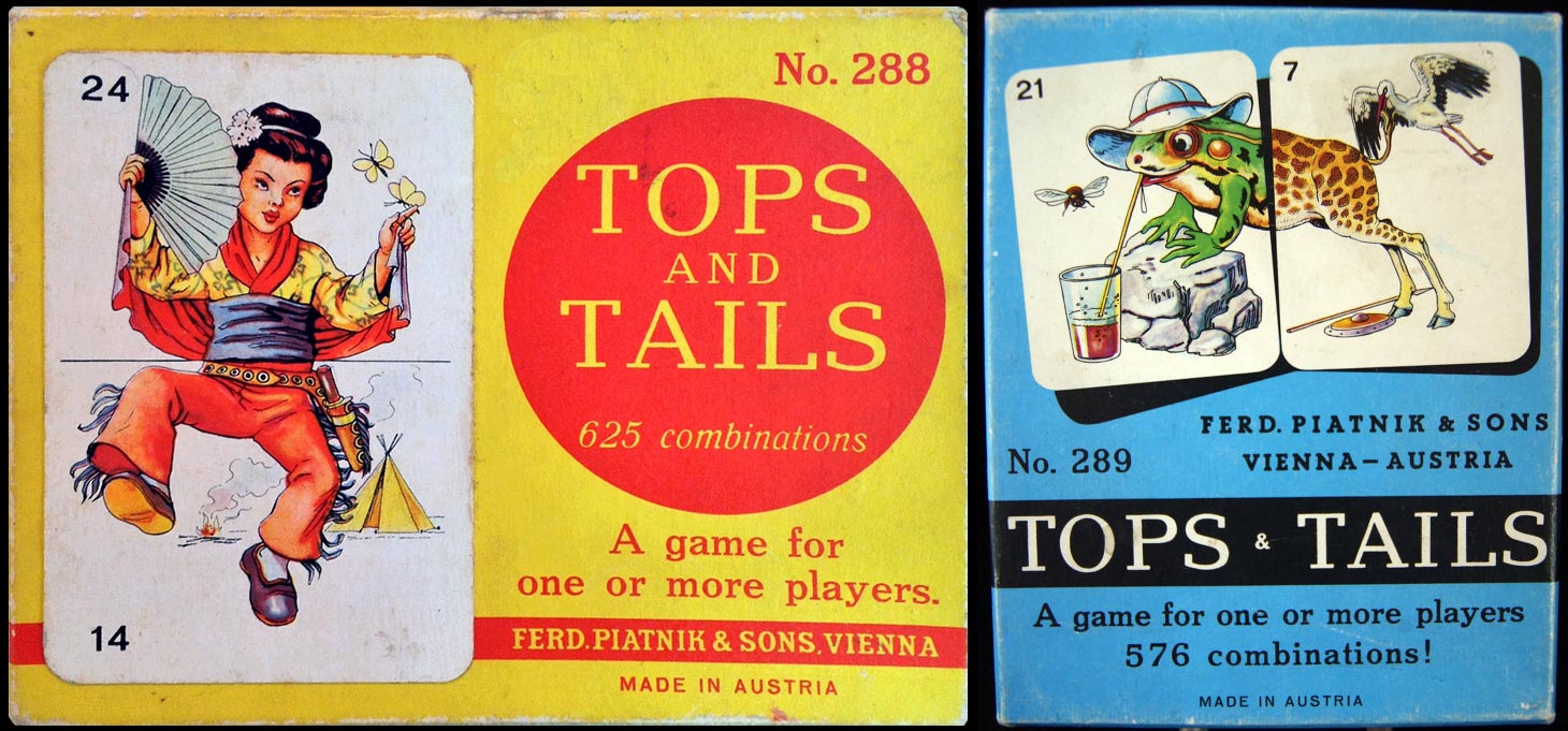 ‘Sports Tops and Tails’ No.290 designed by Willy Mayrl manufactured by Ferd Piatnik & Sons, Vienna, c.1950s. The game comprises 48 cards forming 24 complete comical pictures which can be paired in hundreds of different combinations. Several companion games were also produced featuring animals or costumes, as nos 288 & 289 based on the same idea. The rules for the game are printed on the back of the box►