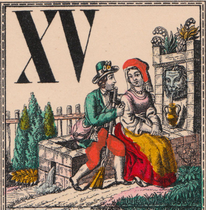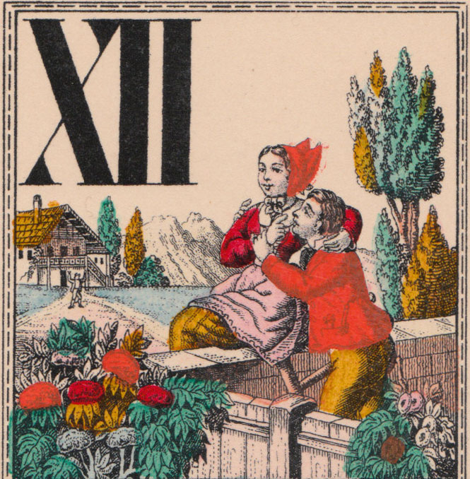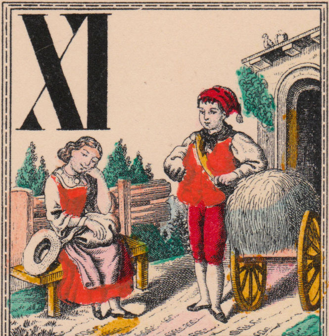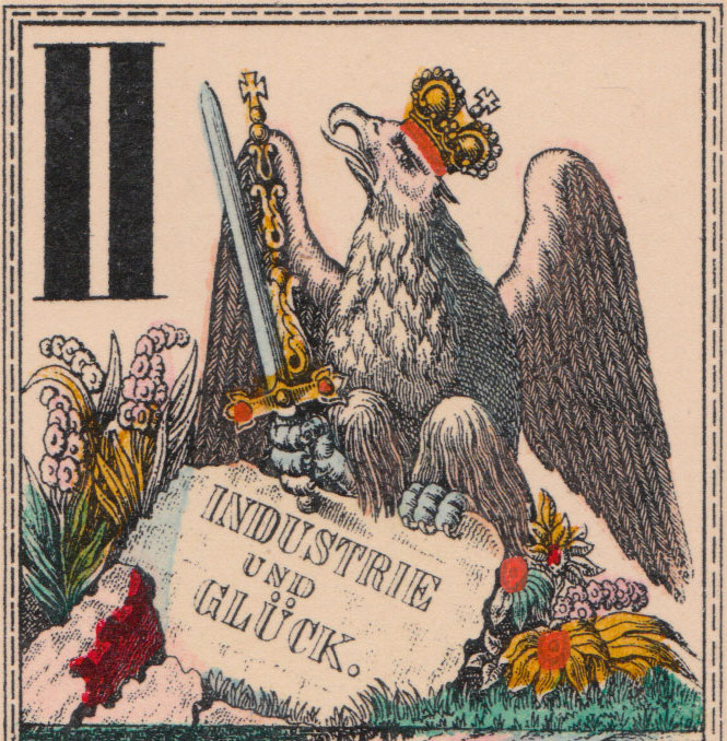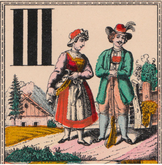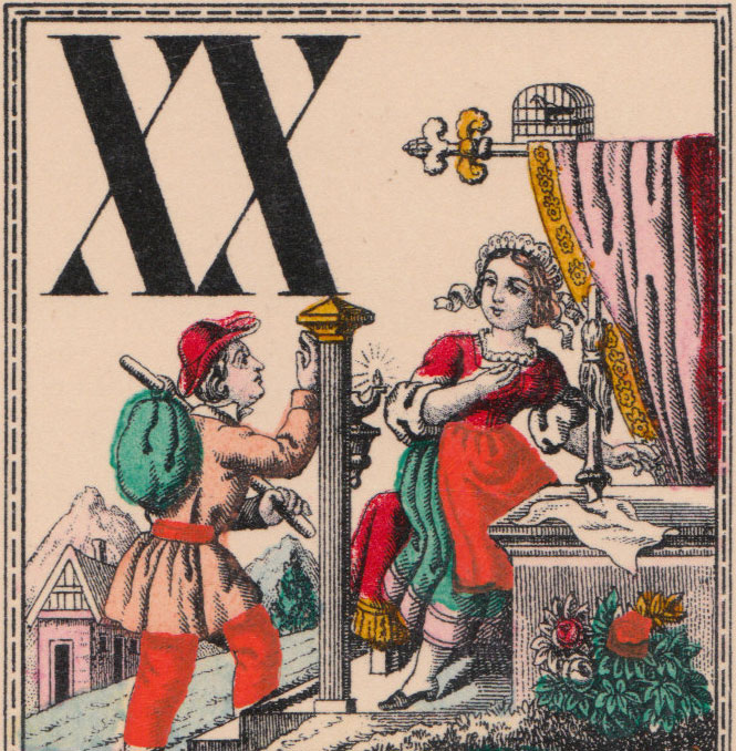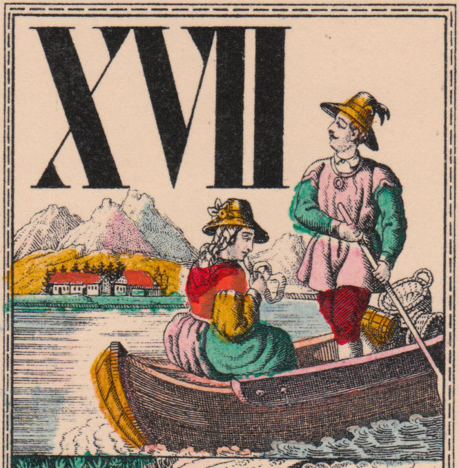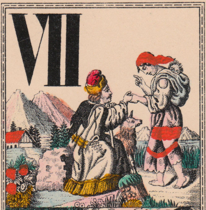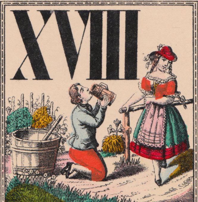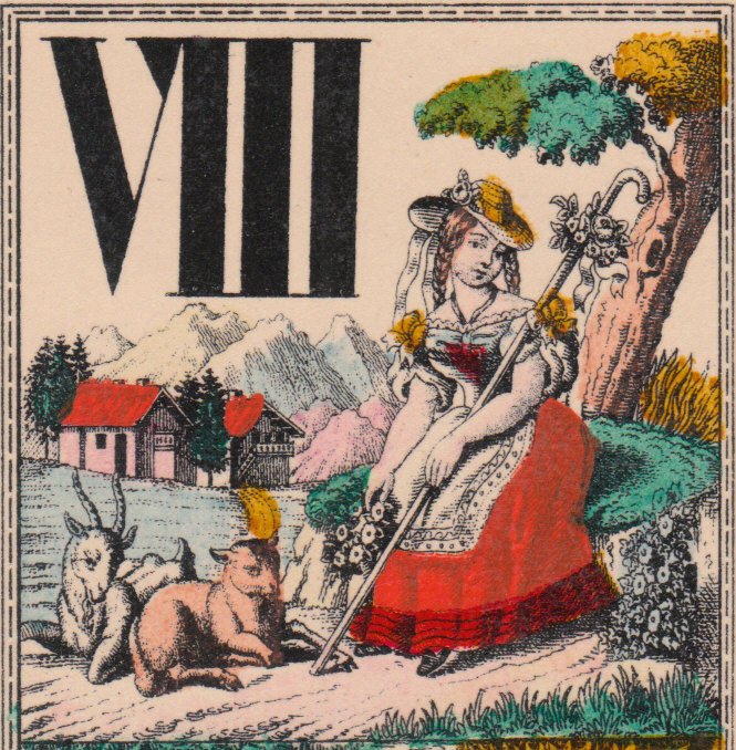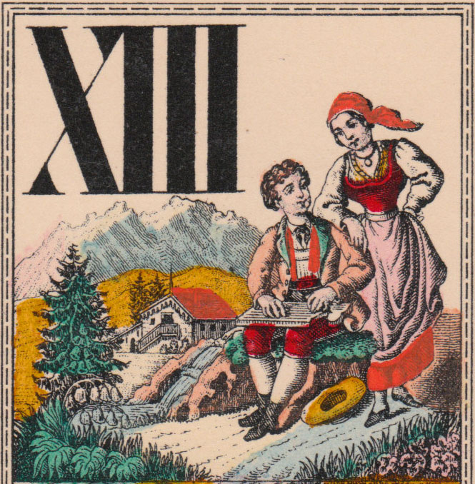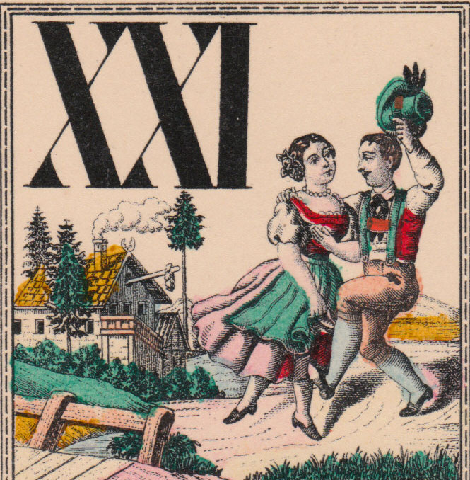 French-suited “Industrie und Glück” or “Rural Scenes” tarot deck manufactured by Ferd. Piatnik & Söhne, Vienna & Budapest, c.1905. The Trumps have large Roman numerals and feature scenes from daily life, mostly happy and often romantic (different at each end), which had replaced the earlier Animal tarots.