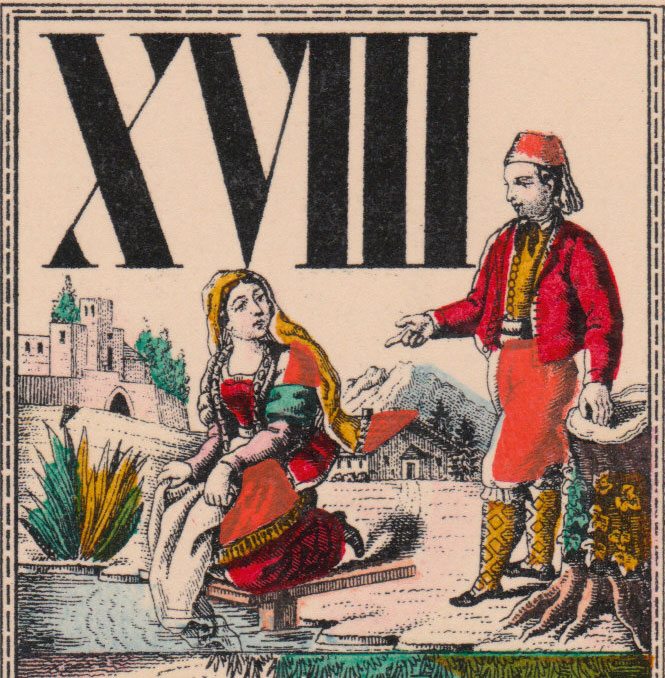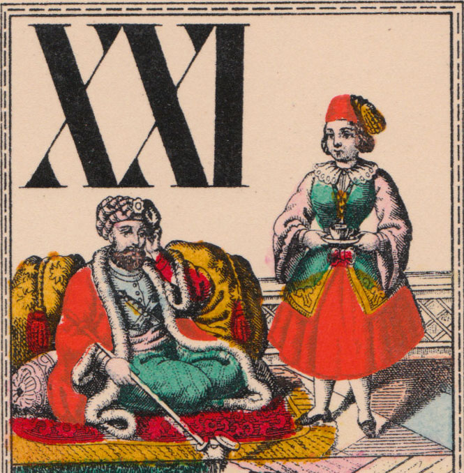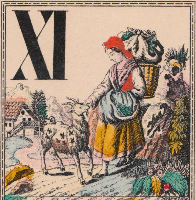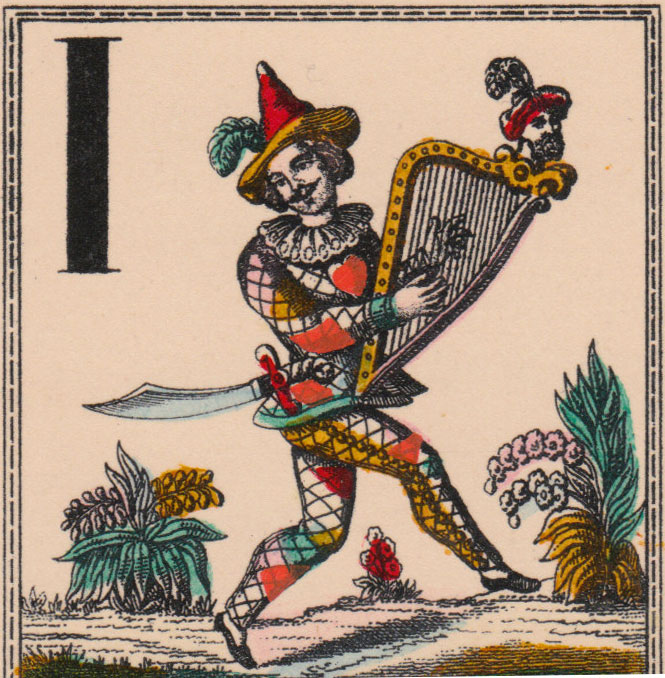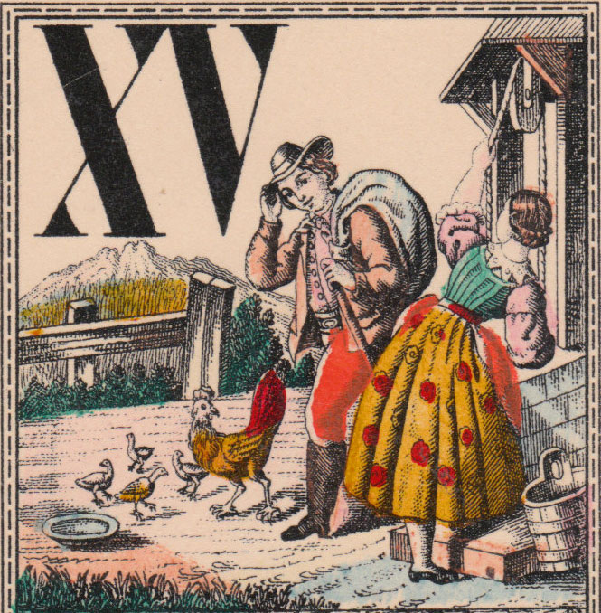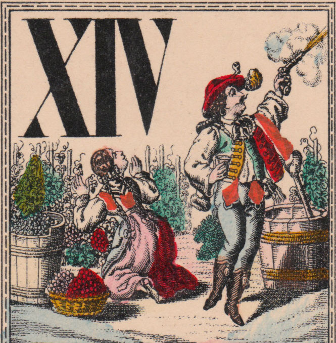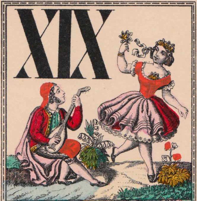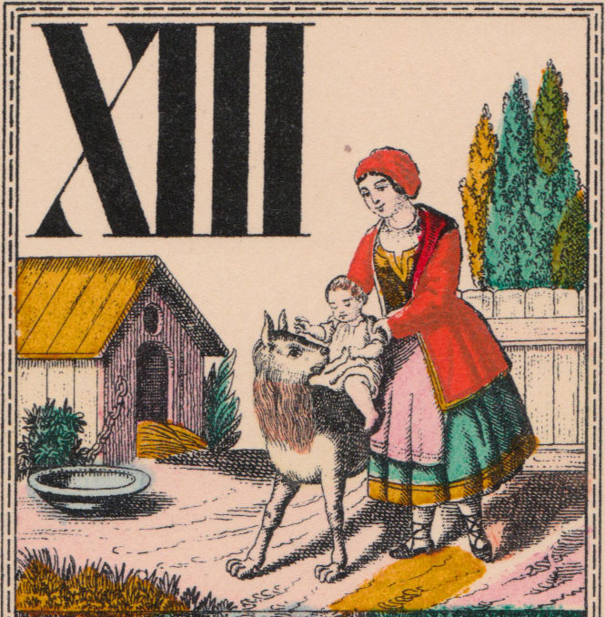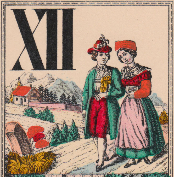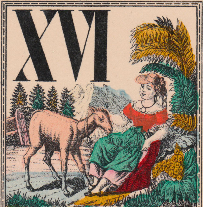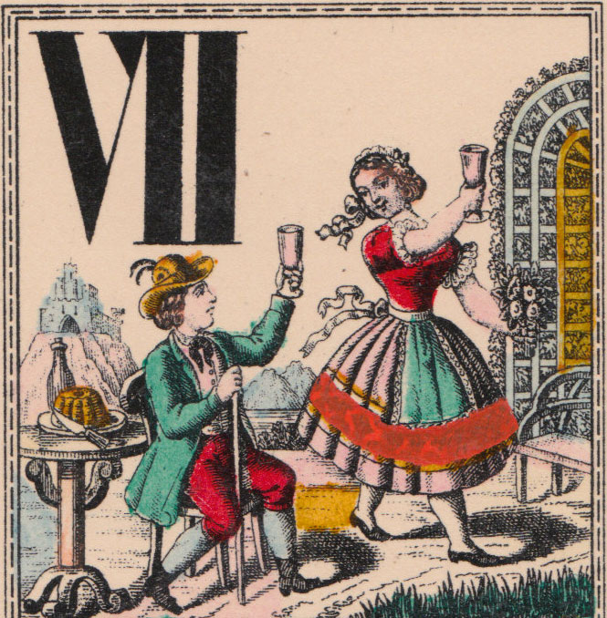 French-suited “Industrie und Glück” or “Rural Scenes” tarot deck manufactured by Ferd. Piatnik & Söhne, Vienna & Budapest, c.1905. The Trumps have large Roman numerals and feature scenes from daily life, mostly happy and often romantic (different at each end), which had replaced the earlier Animal tarots.