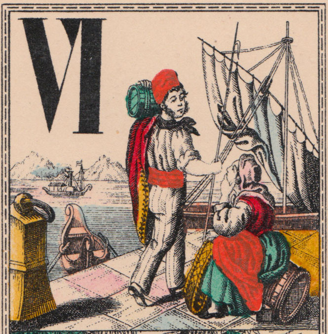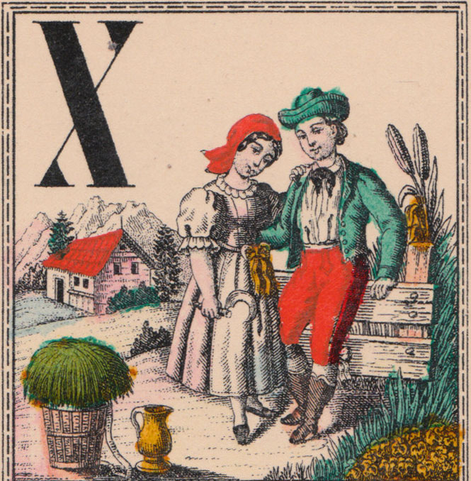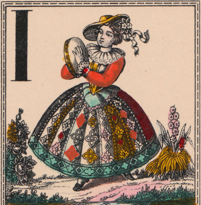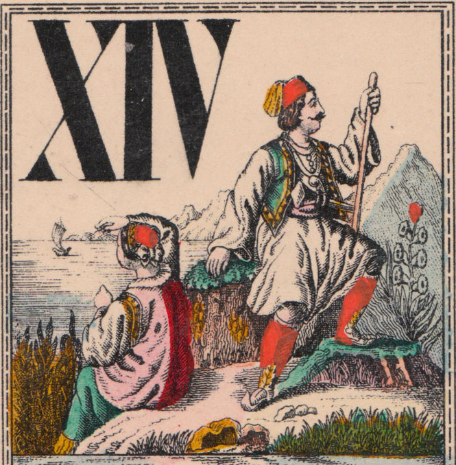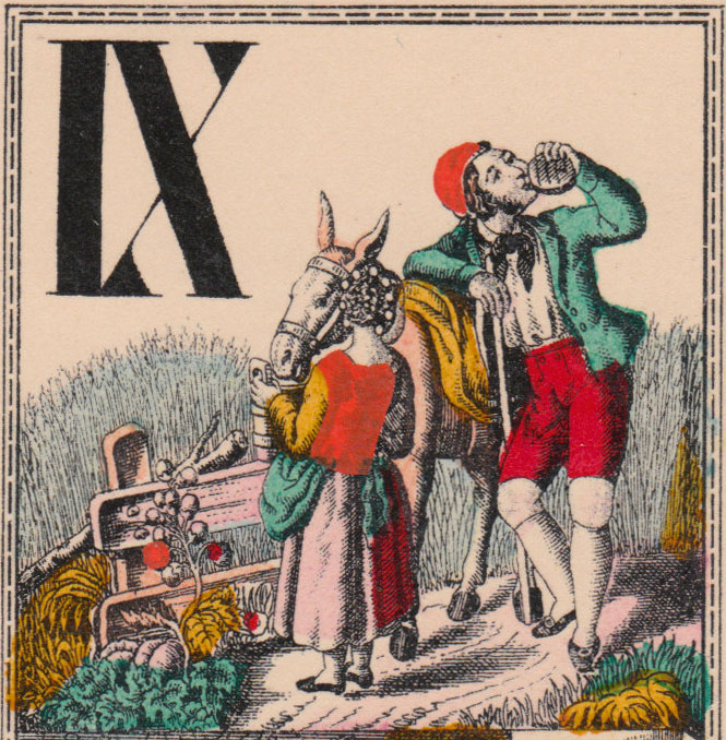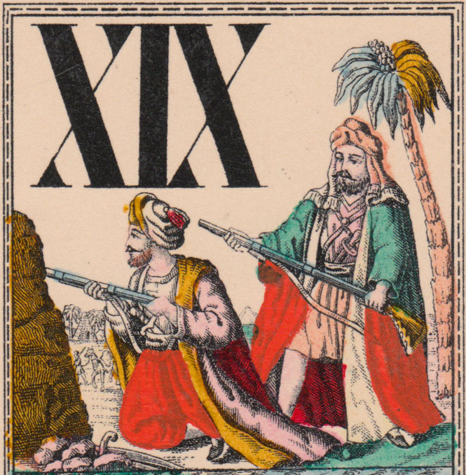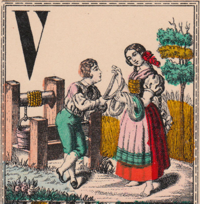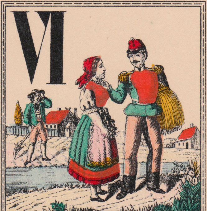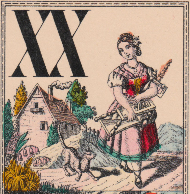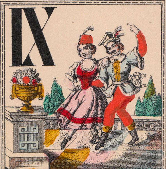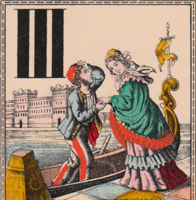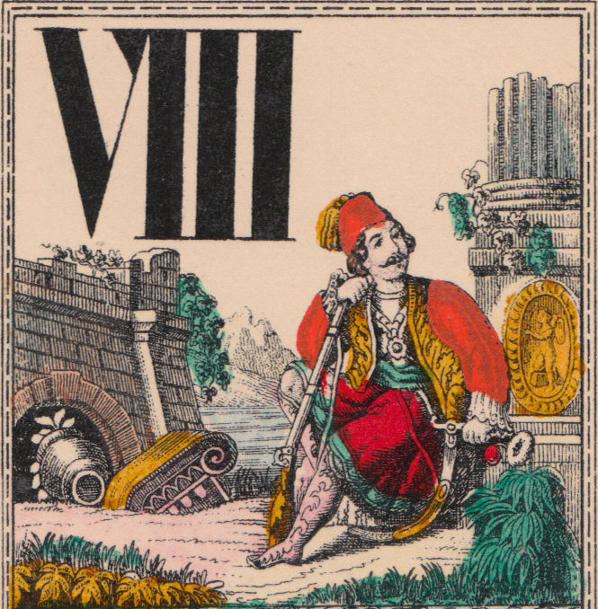 French-suited “Industrie und Glück” or “Rural Scenes” tarot deck manufactured by Ferd. Piatnik & Söhne, Vienna & Budapest, c.1905. The Trumps have large Roman numerals and feature scenes from daily life, mostly happy and often romantic (different at each end), which had replaced the earlier Animal tarots.