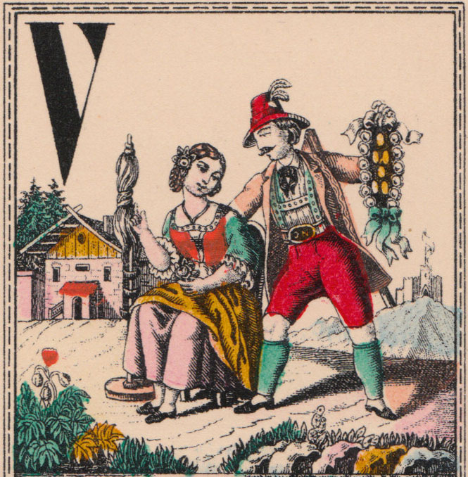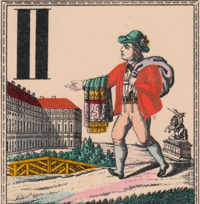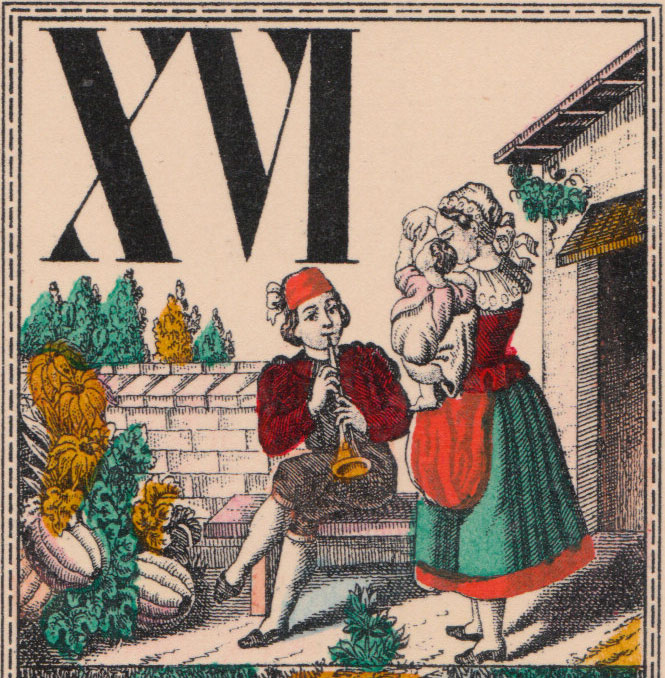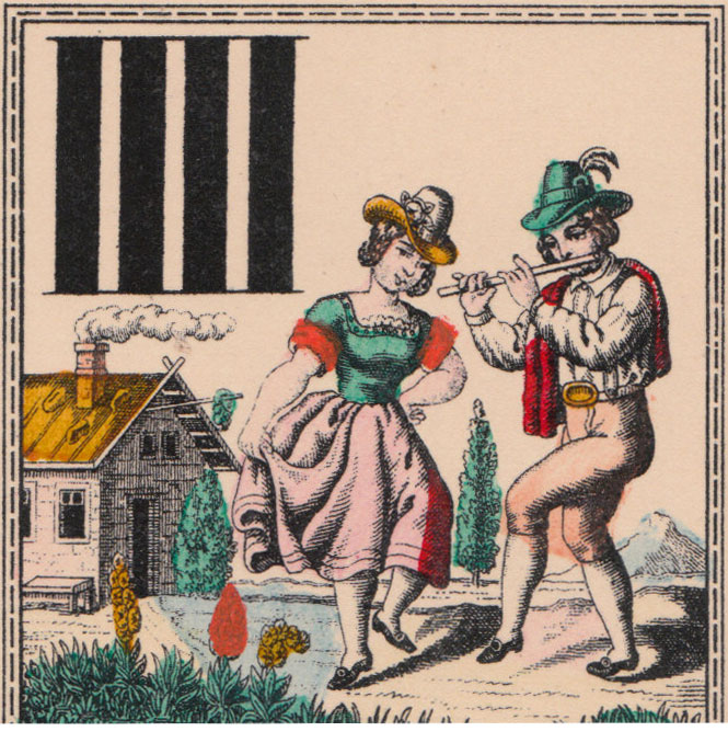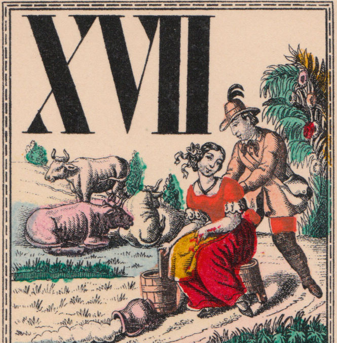 Above: 54-card “Industrie und Glück” or “Rural Scenes” tarot deck based on designs by J. Neumayer, manufactured by Ferd. Piatnik & Söhne, Vienna & Budapest, c.1903-1910. Stencil coloured lithography, square corners and no indices. Images courtesy Rex Pitts.