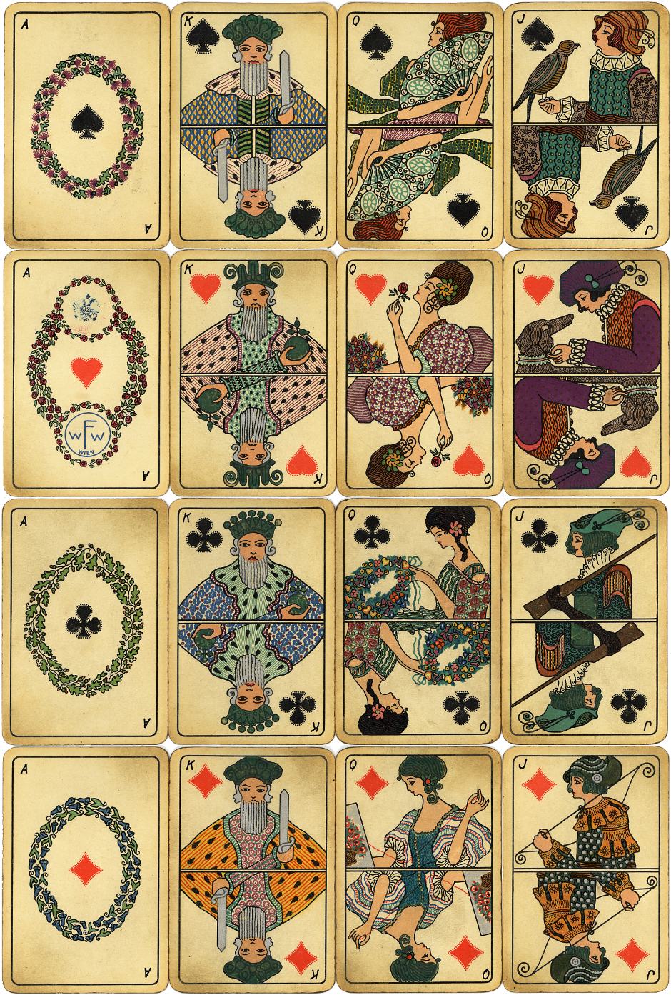 Intended to attract donations on behalf of the Imperial Royal Austrian Military Widows’ and Orphans’ Fund, established in 1914, this elegant and refined deck was designed by Nellie Stern, a member of the Wiener Werkstatte (the Vienna Workshop, a community of visual artists which flourished 1903–1932, famous for it's Art Deco designs). The cards display beautiful subtle colours and intricate detail. The deck was printed by Ferdinand Piatnik & Söhne, Vienna in 1916 and reprinted in 1981 by A.S.S.