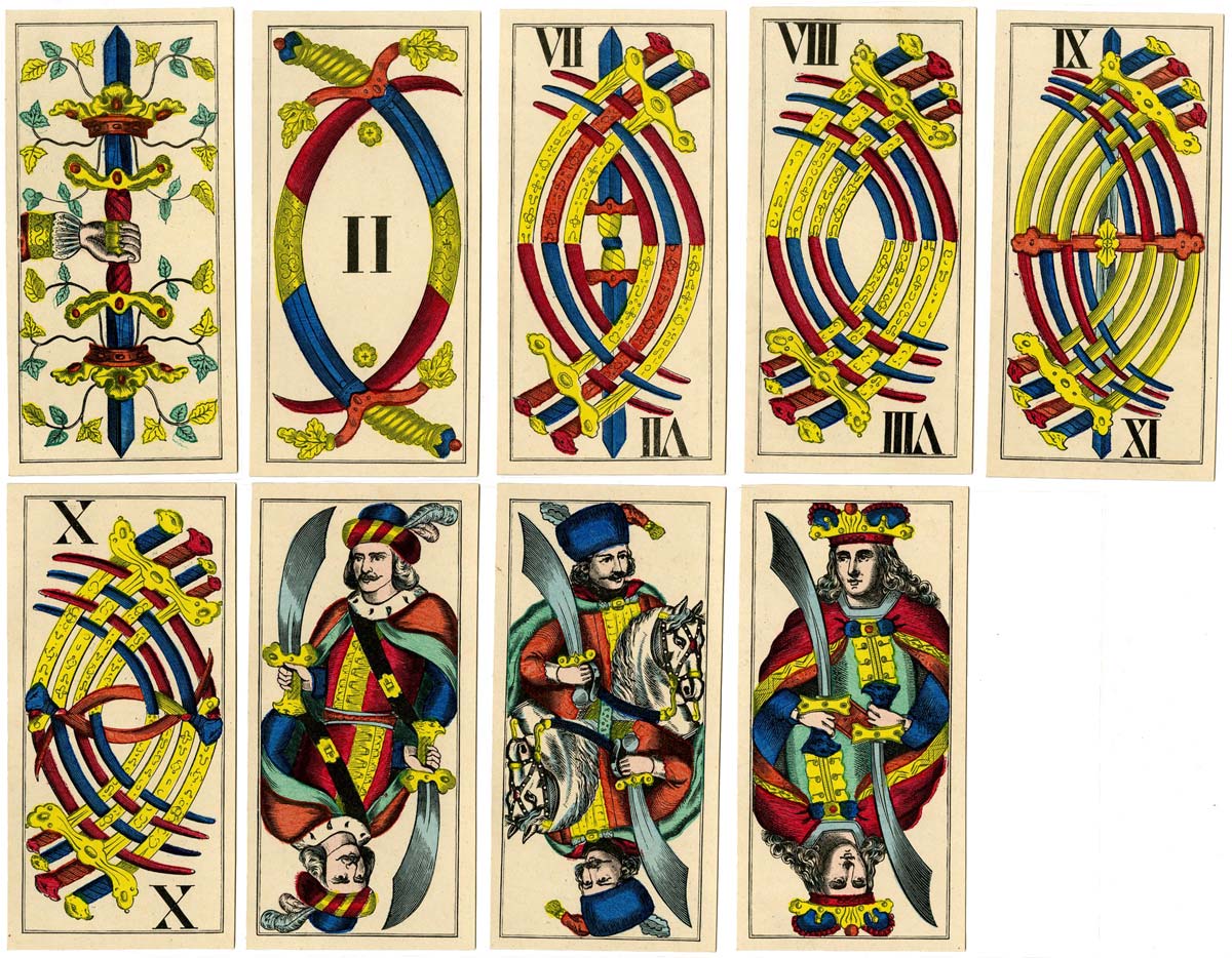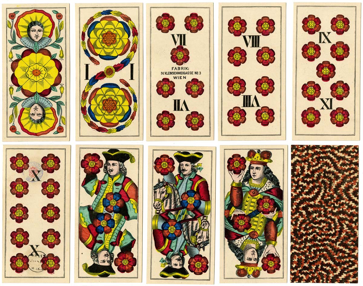 This fine Trappola pack of 36 double-ended playing-cards with Italian suit symbols was published by Joseph Glanz, Vienna, late 19th century. An inscription on the ace of clubs reads “Jos. Glanz in Wien”. On the 7 of roses (coins) is the legend “Fabrik: IV. Kleinschmidgasse No. 3 Wien”. The red & blue tax stamp on the 10 of roses was in use in Austria from 1877 to 1881. See the wrapper