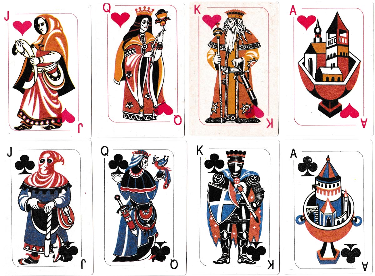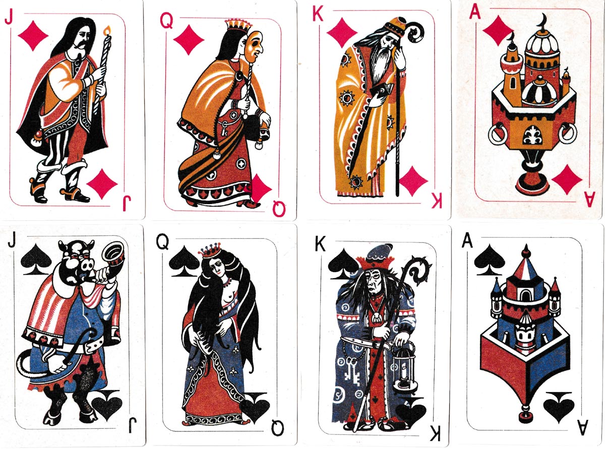 This 36-card pack was produced in 1993 by BADPPR (Belarussian Association of Detective, Popular, and Adventure Novels). This publisher can apparently produce novels in a matter of days and today is in the forefront of the pulp novel business. This unusual non-standard pack may reflect the characters of one of their publications. The aces portray “toy-like” castles, while the courts appear to be wearing medieval costumes. The jack of spades is a pig blowing a horn; the king of clubs is a knight in armour; and the queen of spades bares one breast.