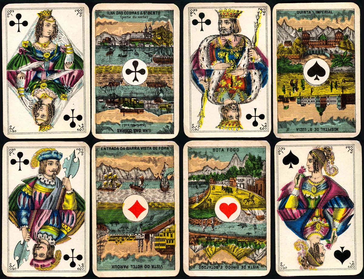 Above: assorted Belgian playing cards, 19th century: a) English style by Mesmaekers, b) Daveluy, 1870, c) Spanish-suited card, 4) Brepols & Dierckx & Son, c.1865.