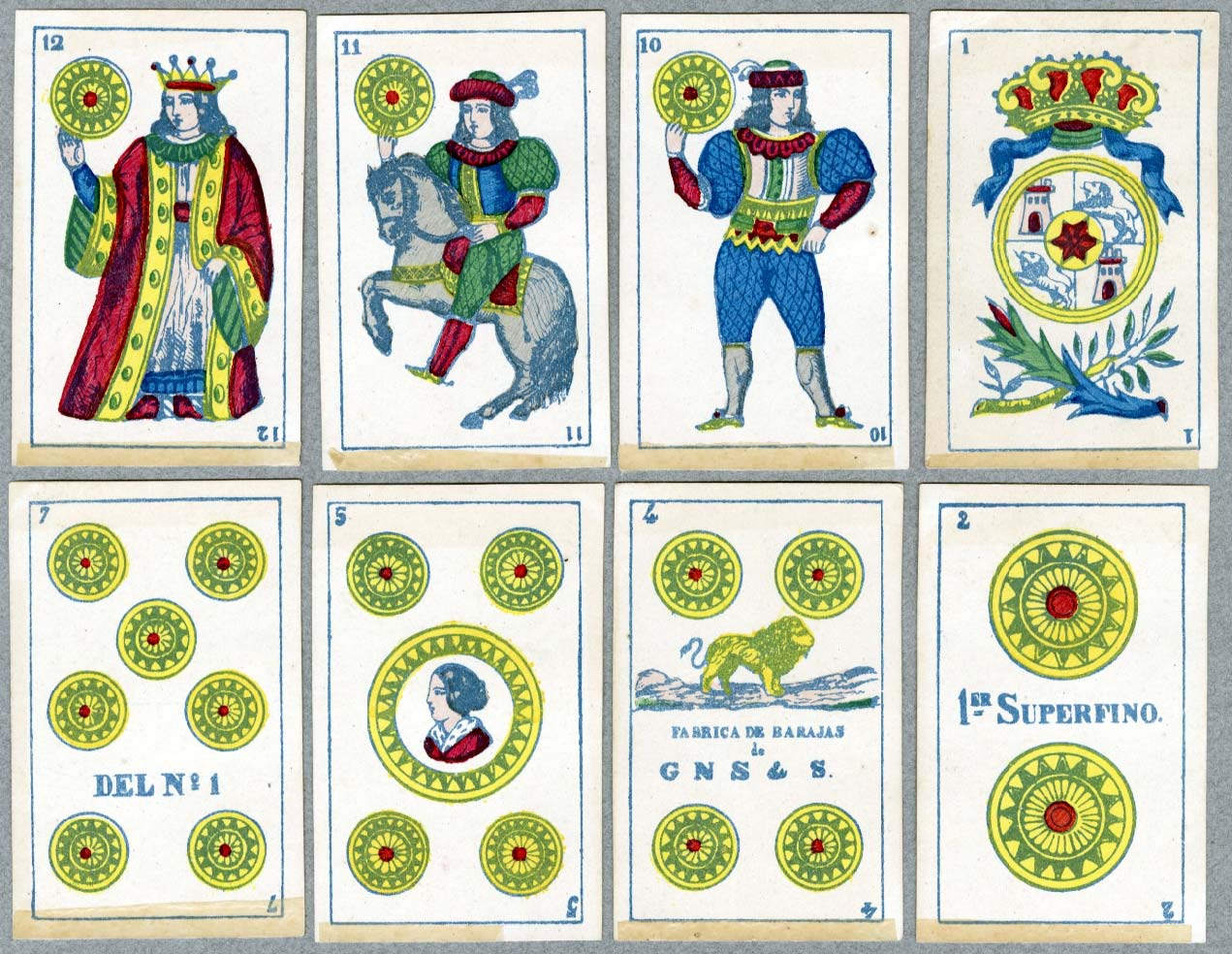 Spanish-suited playing cards made in Belgium by Mesmaekers Frères, c.1875.