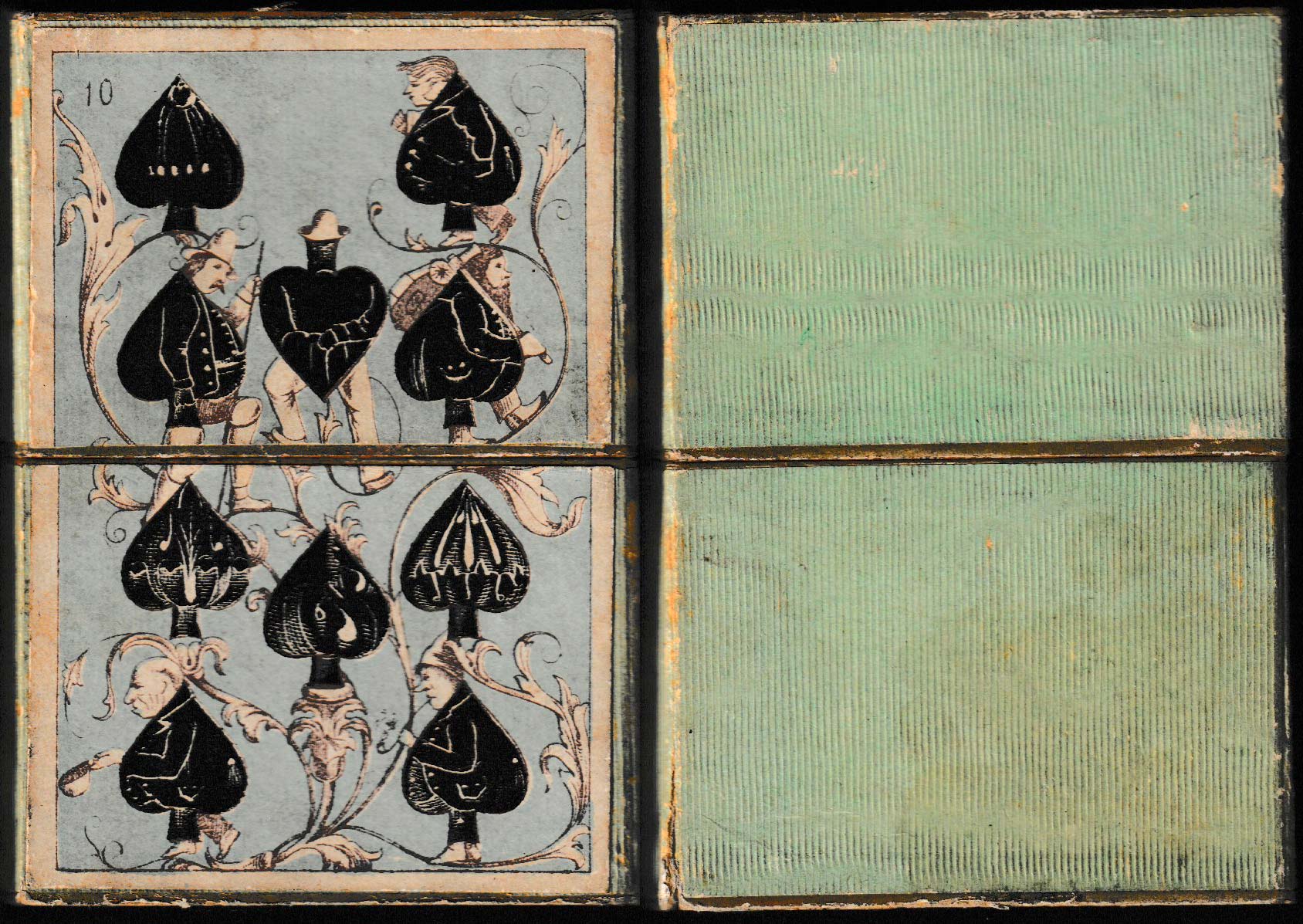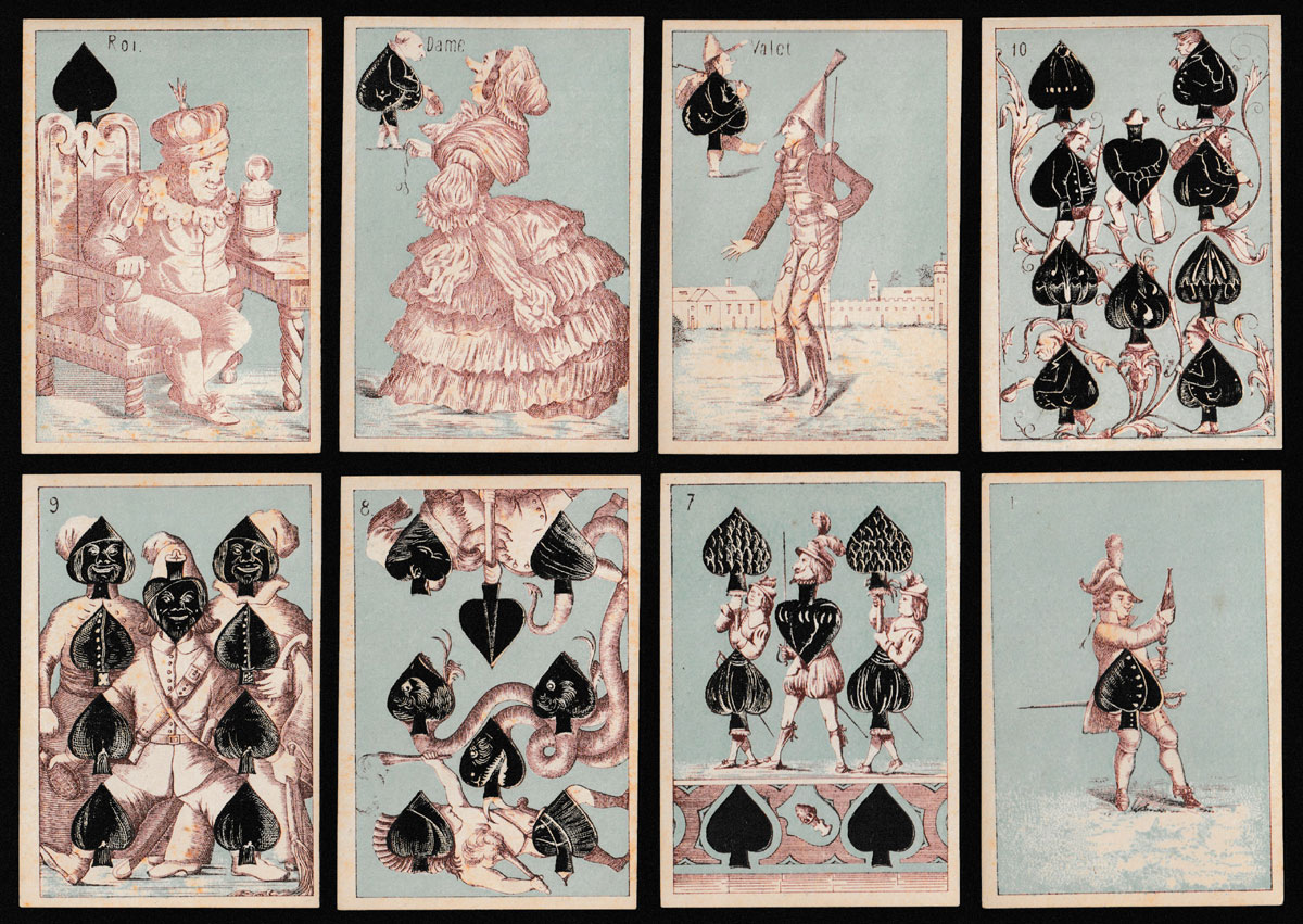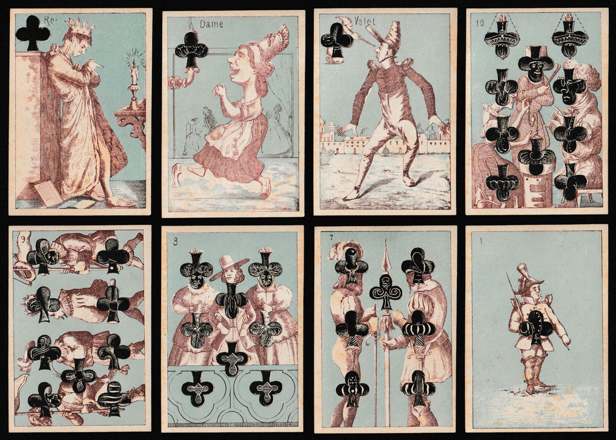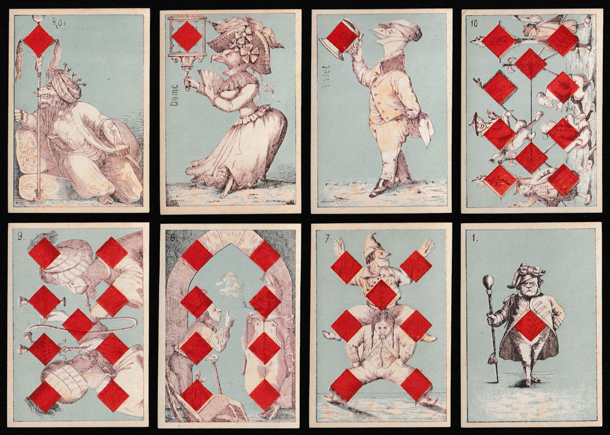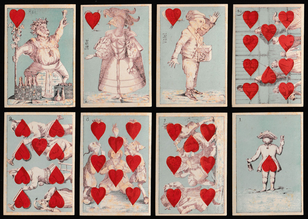 Transformation packs in the 19th century frequently borrowed images from their predecessors, even from packs published in other countries. Most of the numeral cards and some of the court cards in this pack can be traced back to original designs by Braun & Schneider, first published in 1852. On the red suits, anthropomorphic animals and birds can be found on the court cards. The Ace of Hearts and the Ace of Clubs are unlike those by Braun & Schneider. In this set, the cards do not have titles; however, the courts are named in French and the remaining cards are numbered in the top left-hand corner. A pale blue background colour has been used throughout. The ‘tartan’ backs are coloured blue and black. Daveluy of Bruges is thought to have made this pack¹.