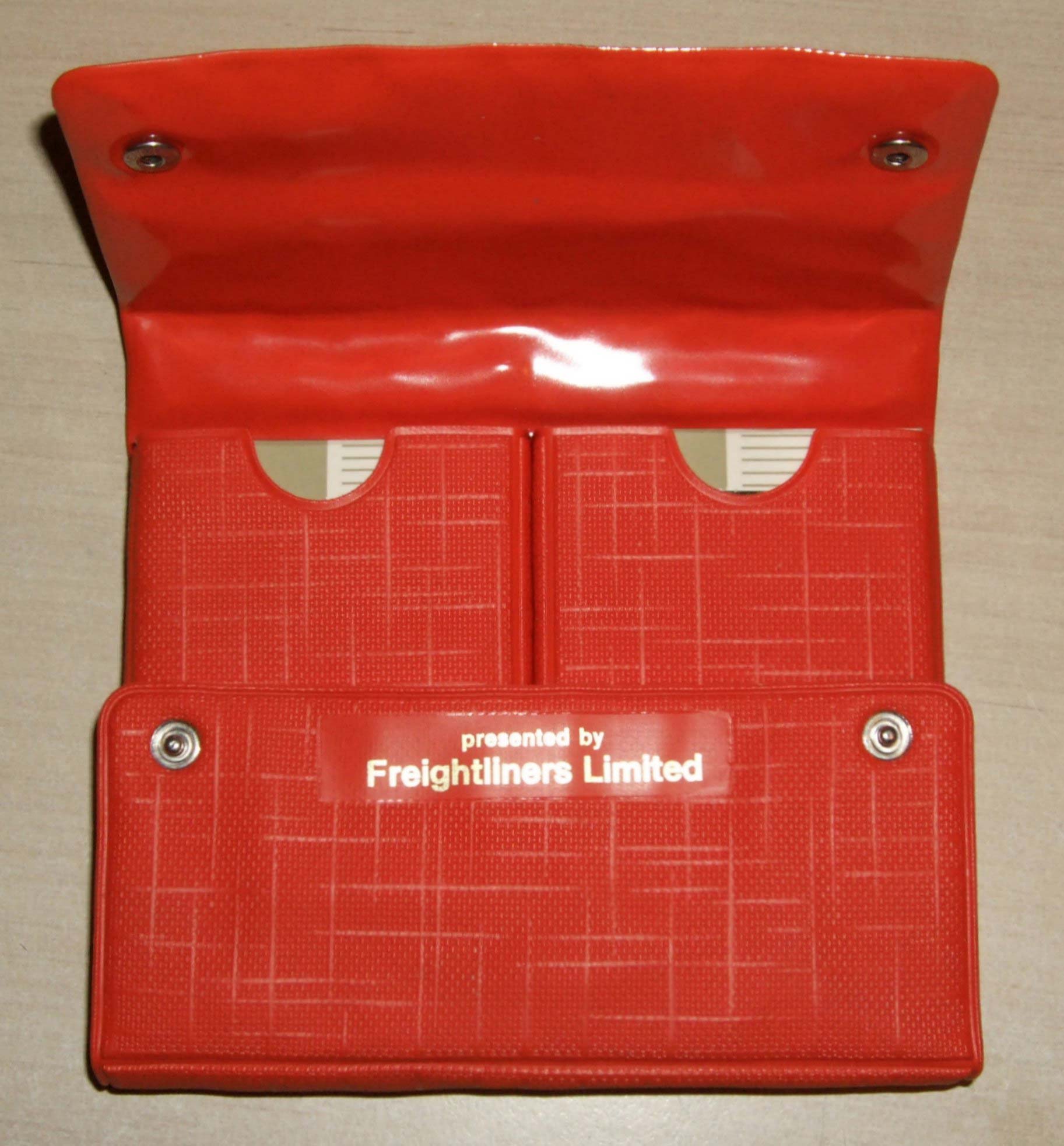 Above: dual-deck English pattern produced for "Freightliners Ltd" around 1969. Each deck has two identical jokers and a bridge score card. Nice Uranium-orange PVC case!►