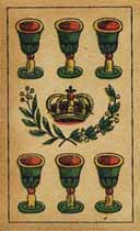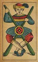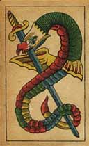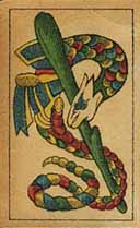 Above: 15 cards from later Portuguese type pack with 'dragon' aces, made in Belgium by Léonard Biermans, Turnhout, c.1878. There is a Brazilian Real Fabrica insignia on the wrapper. 48 cards, size: 81 x 59 mm; lithographed. The dog has disappeared from the Maid of clubs but the Maid of coins holds a small chest as in earlier types. Click here to see more. | ||||