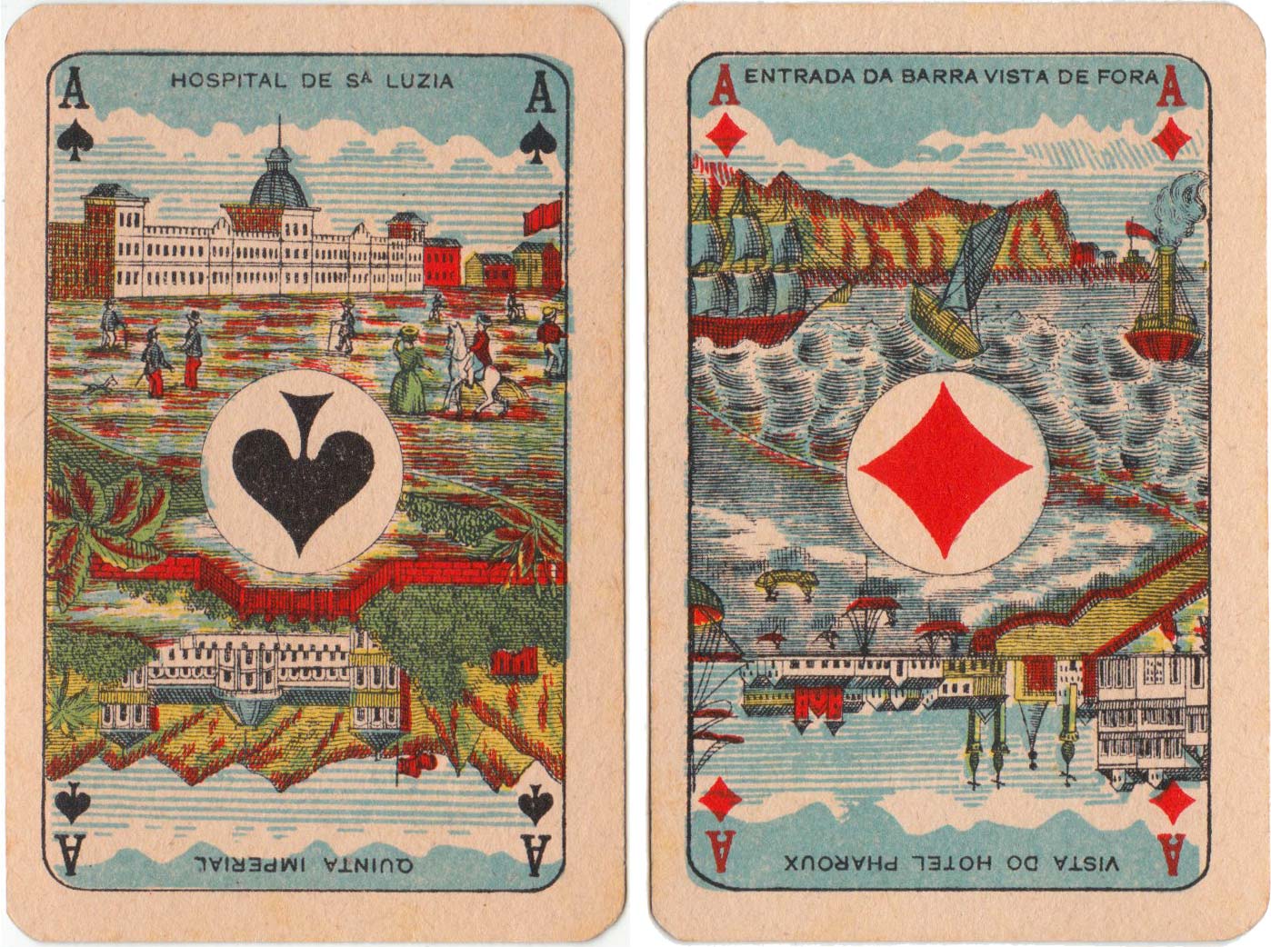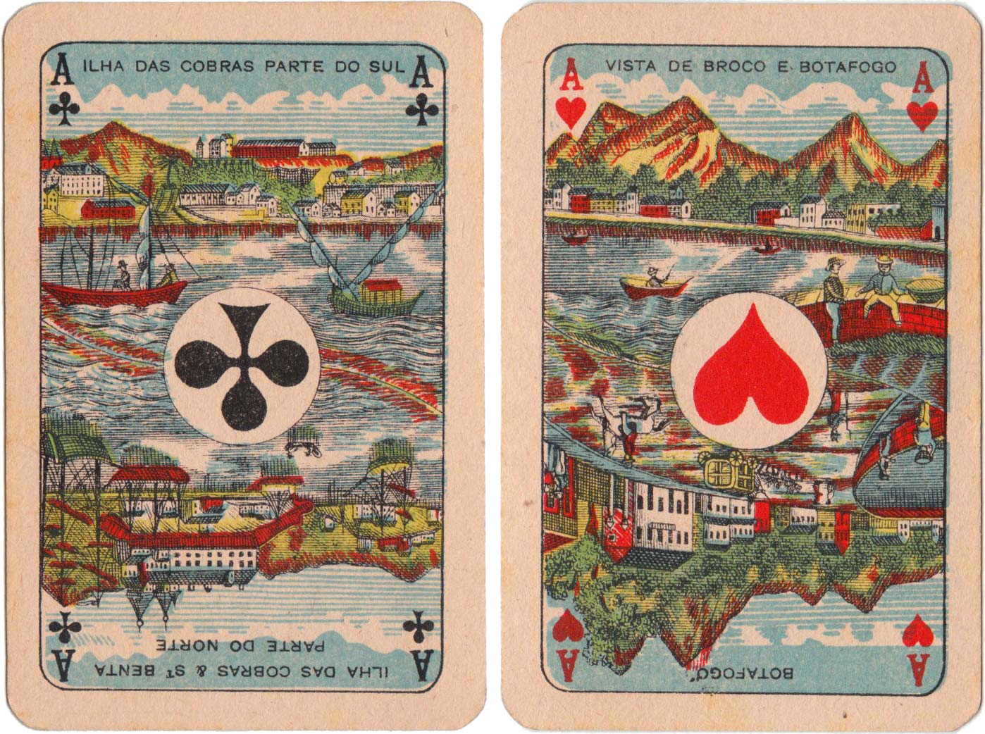 Genoese pattern (Cartes Françaises) with Pictorial Aces for Brazil by Fabriques Brepols, Turnhout. These are pretty old but exact date unknown. The pictorial Aces are Brazilian locations near to Rio I believe. The back has a criss-cross pattern. During the late 19th century there was a trend for playing cards with exotic scenes on the Aces which continued well into the 20th century. Whilst business was difficult after the First World War, advertising packs were gradually increasing and Belgian manufacturers successfully exported wares such as “Cartes Portugaises ou Brésiliennes” to foreign markets, ultimately bringing the demise of the earlier Portuguese pattern which has now become extinct.