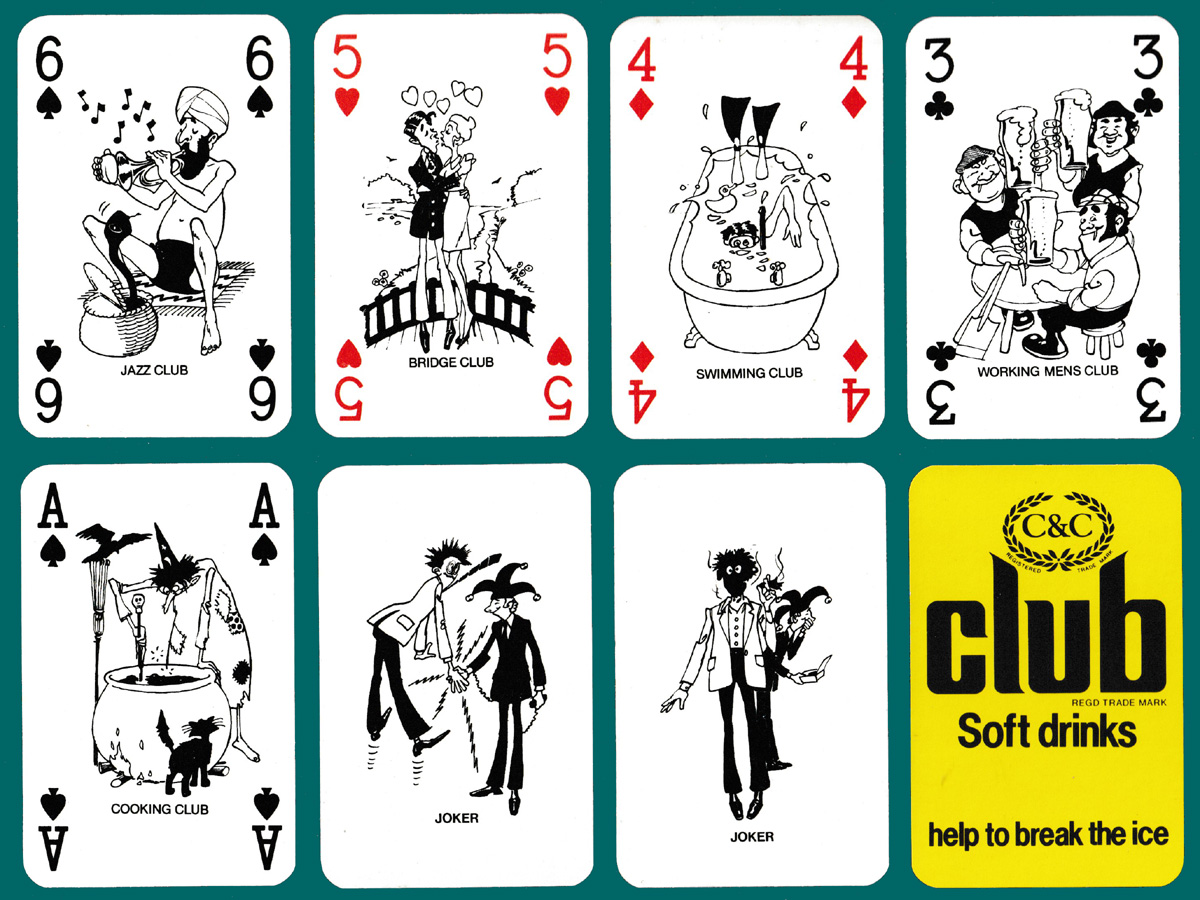Considerable ingenuity has gone into the designs of this pack which comprises 52 black-and-white illustrations of different types of ‘club’. Each cartoon has the name of the club beneath the image. Some are clever plays on words, such as ‘night club’ (JS). Only the backs – in bright yellow and black – mention the products being advertised. The “C&C” in the logo stands for Cantrell & Cochrane, the Irish manufacturer and distributor of Club Orange, Club Lemon, etc. See the box