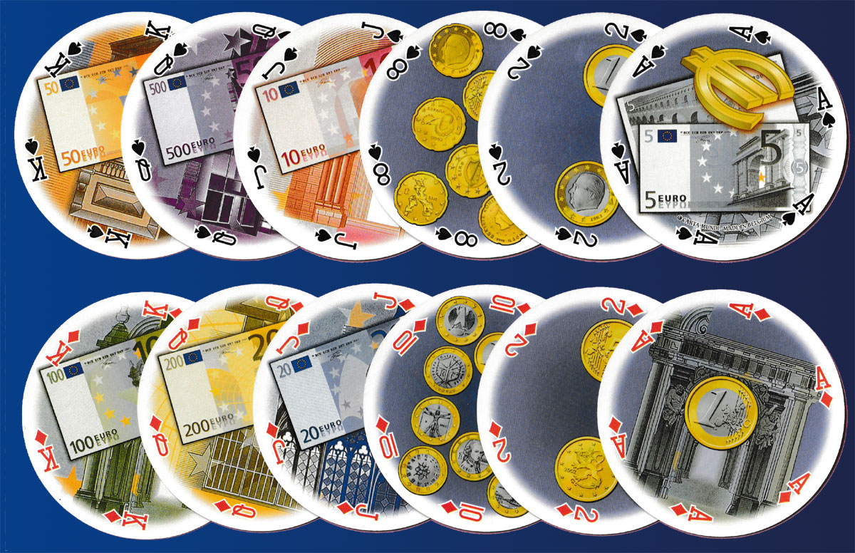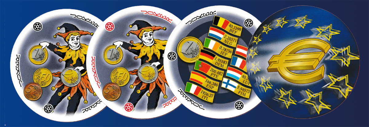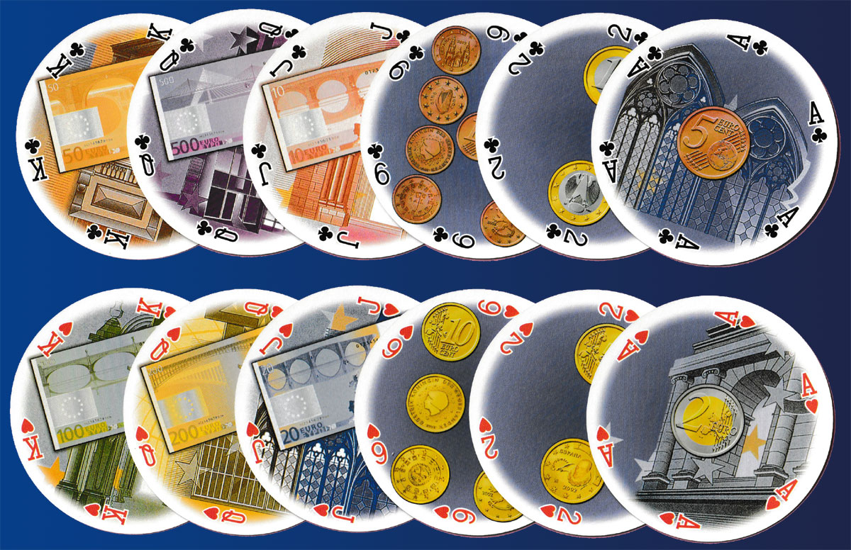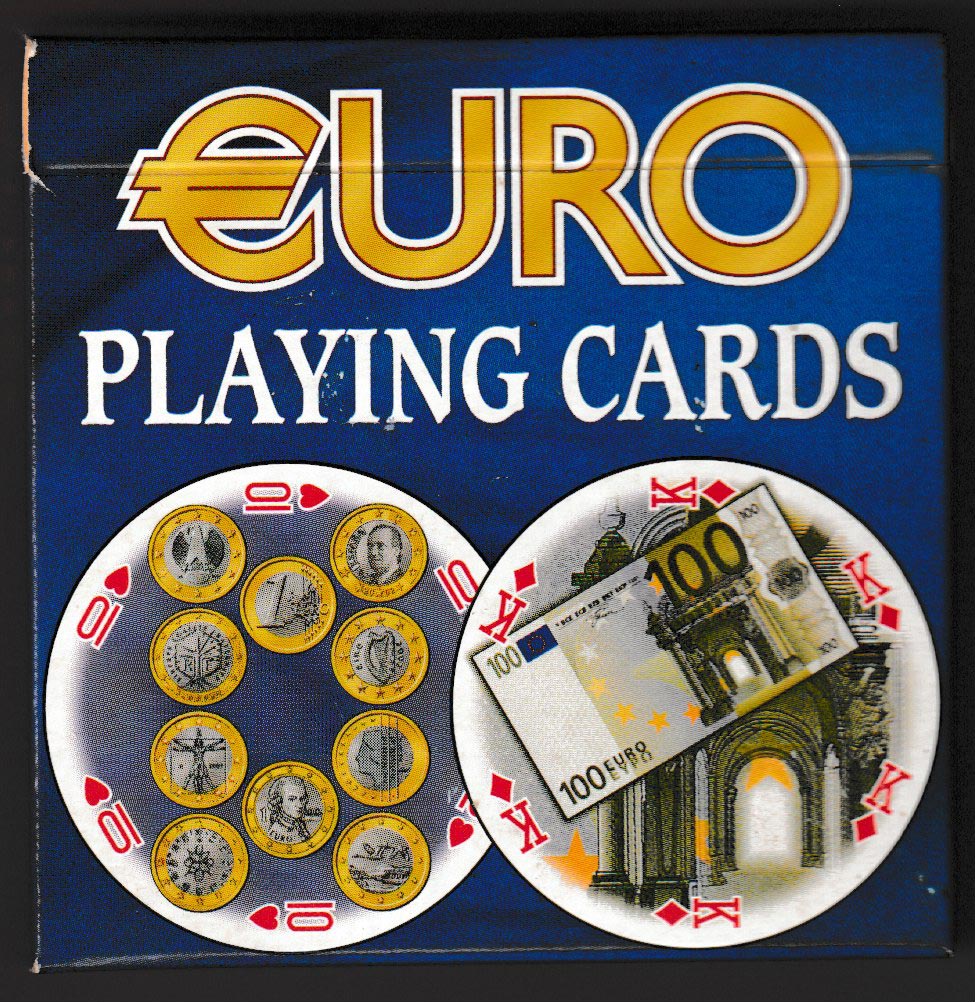 Ahead of the official launch of the new euro currency on 1 January 2002, a number of souvenirs were produced including these playing cards. The circular format was no doubt thought to be appropriate to match the shape of the coins. Six of the court cards (S + D suits) show the faces of the new banknotes, while the other six (C + S suits) show the backs. Three of the Aces depict a single coin; the Ace of Spades shows the euro symbol and the face of a 5 euro note. On the 2s to 10s, the appropriate numbers of coins replace the central pips: those on the 2s are all different but the other numeral cards have the same designs in each suit. Coins from 10 of the 12 countries which originally adopted the euro (but not Greece or Luxembourg) are included somewhere in the designs. On the back is the euro symbol surrounded by 12 stars. See the box►