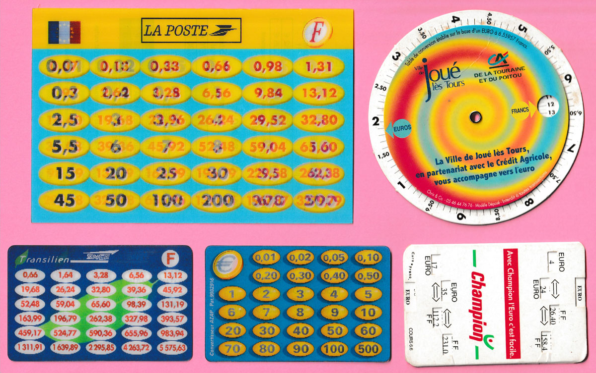 In order to become familiar with the new coins, one could practise at home with packs of 40 (equivalent to 100 francs). Conversion tables, often using holograms, were offered free by many businesses. These are now collectors’ items.