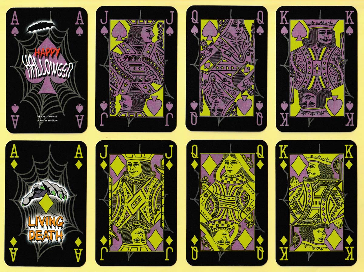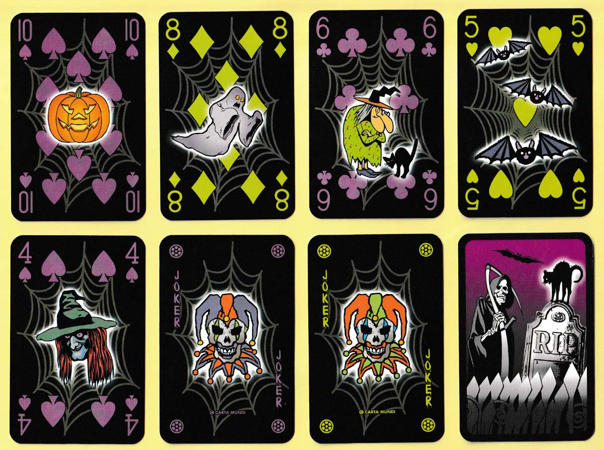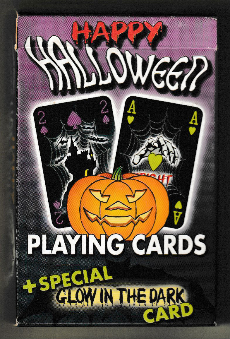 Above: Happy Halloween playing cards printed and published by Carta Mundi, Belgium, c.2001. 52 cards + 3 Jokers (including 2 identical ones) + 1 glow in the dark card in tuck box. Size: 56 x 87 mm.