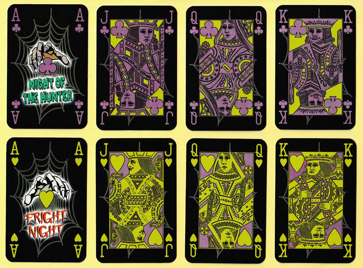 Black backgrounds incorporating a spider’s web form the backdrop for these Halloween designs. The court cards use standard English faces but coloured mauve (black suits) with fluorescent lime green backgrounds and fluorescent lime green (red suits) with mauve backgrounds. The remaining cards feature different motifs associated with Halloween such as black cats, pumpkins, bats, spiders, ghosts, etc. A special glow in the dark card is also included. The back design features the grim reaper alongside a headstone marked “RIP”, above which are a black cat and a bat. See the box►