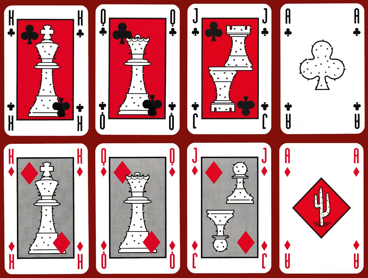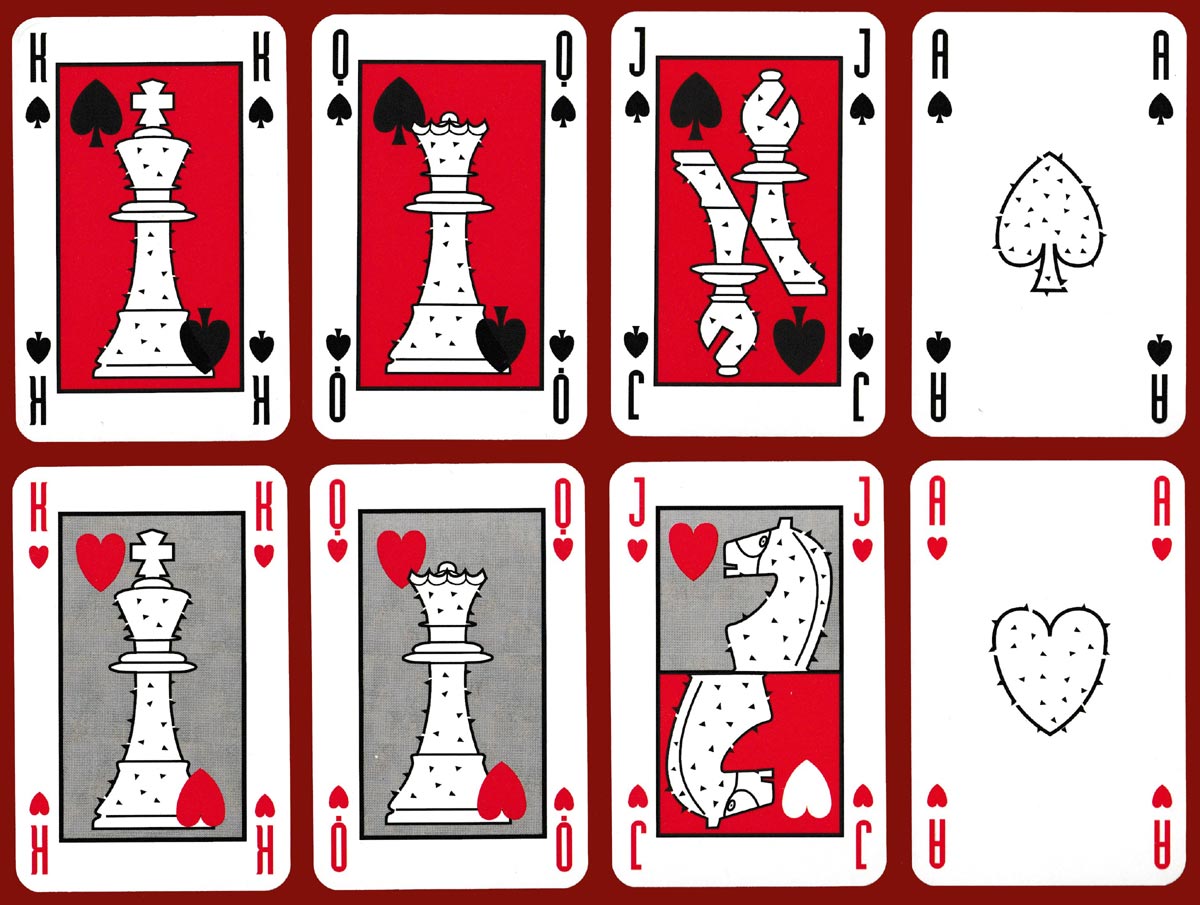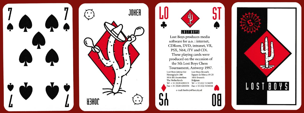 These cards were produced on the occasion of the 5th Lost Boys Chess Tournament, Antwerp, 1997. Naturally, they feature chess pieces, all looking rather spiky, like the cacti on one of the Aces, on the Jokers and on the back design (presumably the company logo). The Kings, Queens and Aces are single-ended, while the Jacks are double-ended. All the courts are set against either a red or a grey background or a combination of both. The indices have a modern feel. Lost Boys produces media software. See the box►