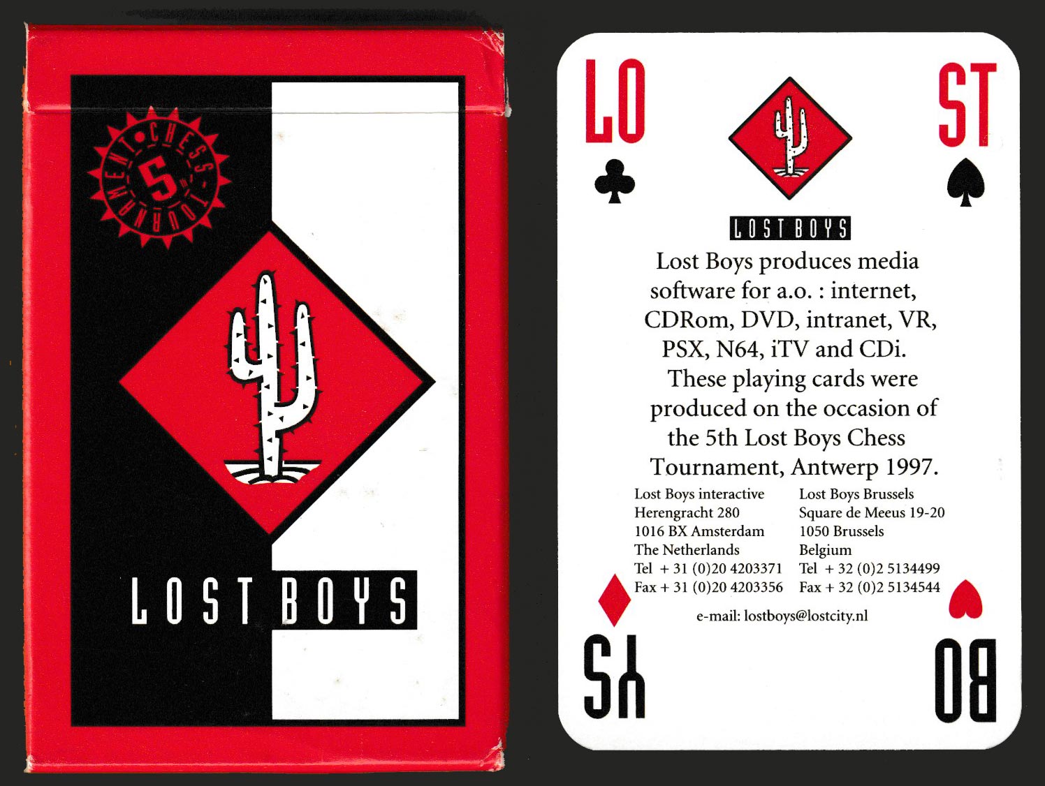 Above: Lost Boys playing cards produced by Carta Mundi, Turnhout, Belgium, for Lost Boys Brussels, Brussels, Belgium, and Lost Boys Interactive, Amsterdam, The Netherlands, 1997. 52 cards + 2 Jokers + 1 title card in tuck box. Size: 56 x 87 mm.