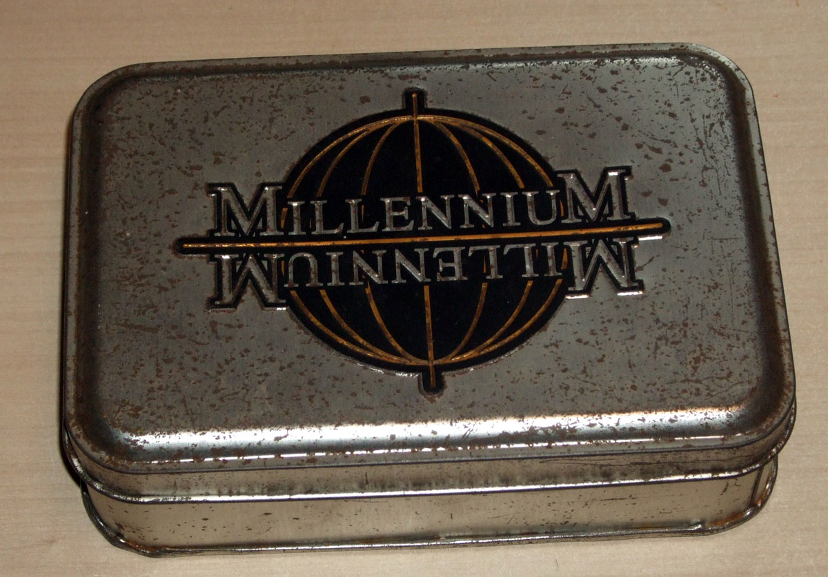 Above: ‘Millennium’ playing cards by Carta Mundi, 1999, in a limited edition of only 25,000 sets. One pack is silver-backed with gold edges, the other is gold-backed with silver edges. Both packs are Bridge-sized with four indices. The ‘Millennium’ logo seen on the backs of the cards is also featured on the luxurious metal box container. Images courtesy Matt Probert.