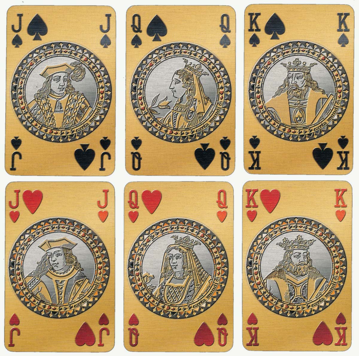 ‘Millennium’ limited edition playing cards by Carta Mundi, 1999. The cards have a grained surface effect and the courts, based on the standard French pattern, resemble trompe-l'œil commemorative medallions.