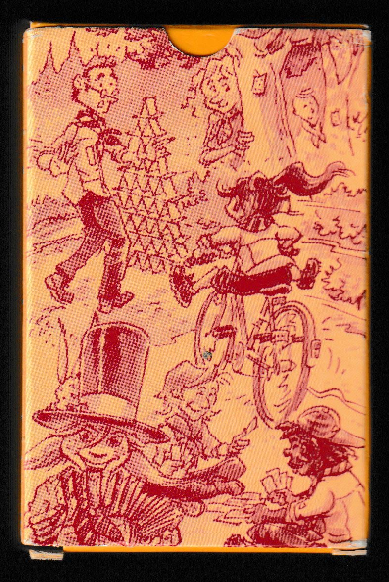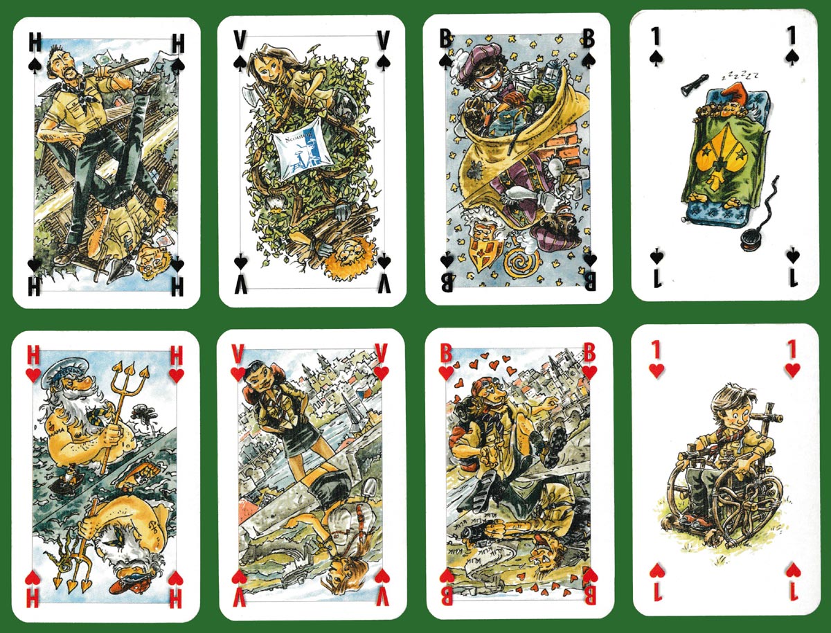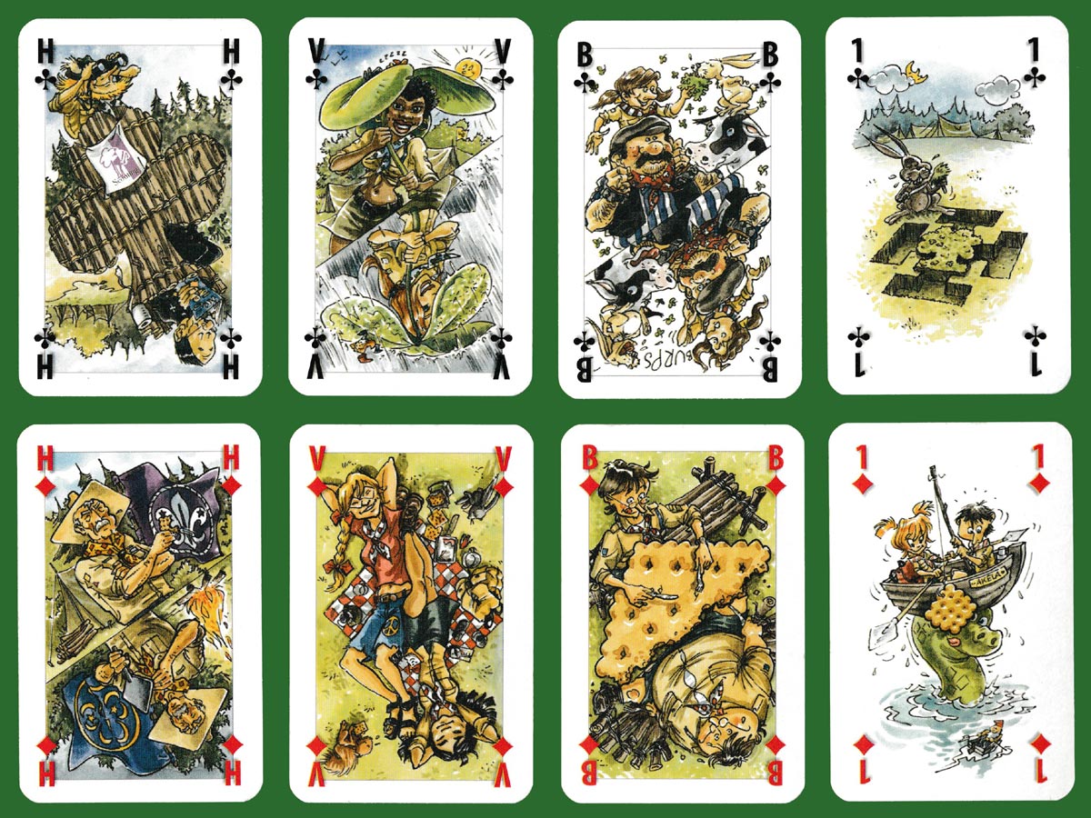 The slogan on the back of these cards reads “scouting, da’s Durven” which means “scouting, that’s Daring”. The cards therefore show some of the “daring” activities in which scouts and guides may engage. Every card is illustrated in a cartoon style, with the court cards having a different design at each end, and some of the pips on the numeral cards being “transformed”. VVKSM was the Flemish Federation of Catholic Scouts and Guides. It changed its name in 2006 to SGV (Scouts and Guides of Flanders). The indices are in Dutch. See the box►