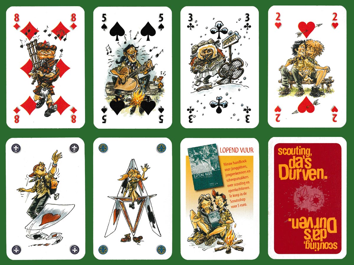 Above: Scouting playing cards printed by Carta Mundi for VVKSM vzw, Antwerp, Belgium, 2003. 52 cards + 2 Jokers (marked with scout and guide emblems in the four corners) + extra card in tuck box. Size: 56 x 87 mm.