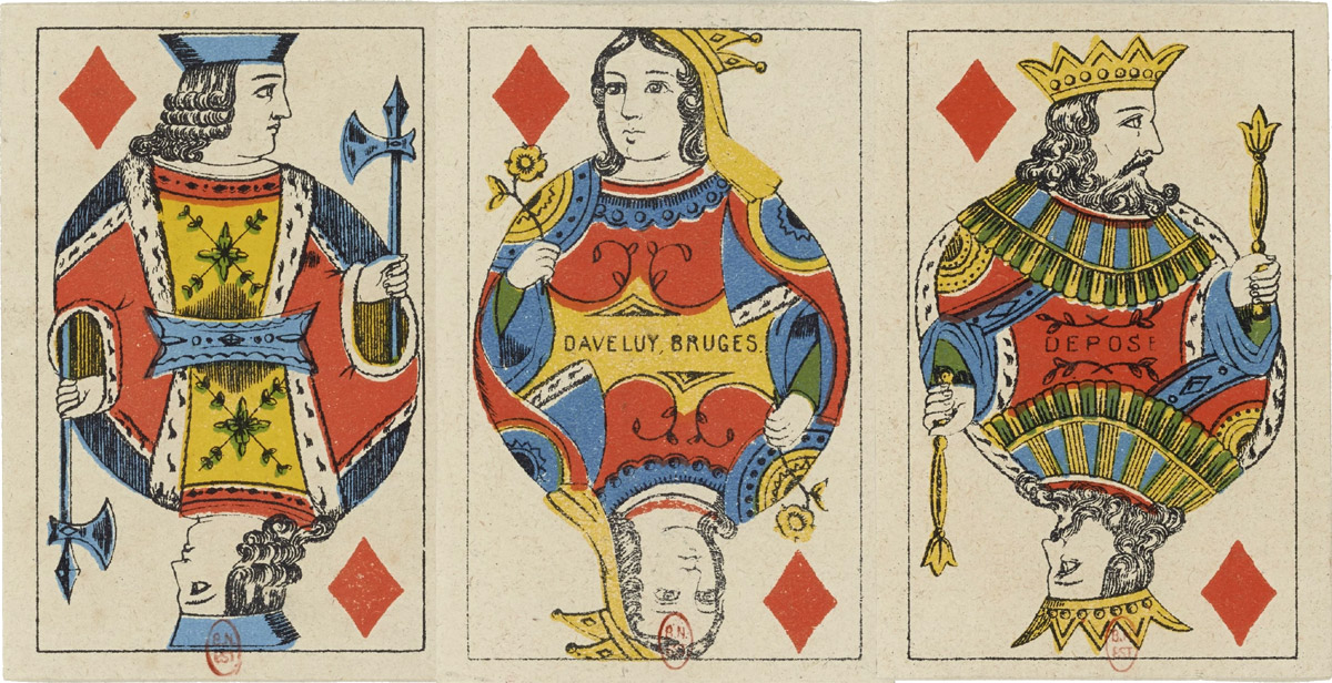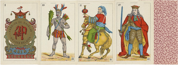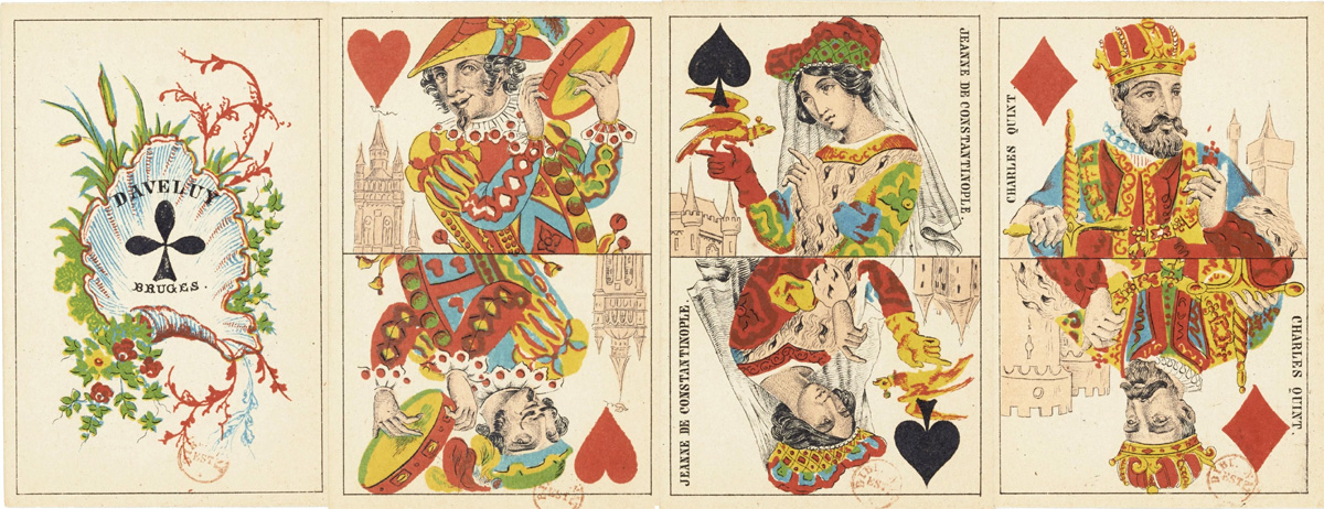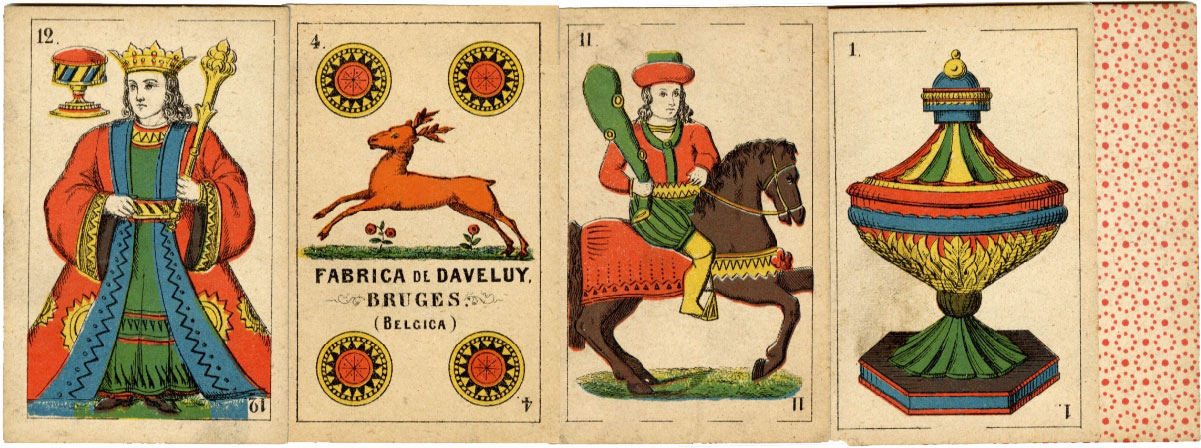 Édouard Alexis Daveluy (1812-1894) founded his press in Bruges in 1835. The firm gained a good name printing newspapers and also portrait, landscape and art photography. He gained various certificates for the printing and manufacture of playing cards, and was appointed Lithographer to the King in 1842. In 1847 he filed a patent for “a method of manufacturing playing cards in chromolithography”. Édouard Daveluy gained a lot of honourable mentions in various foreign exhibitions. His playing cards were distributed all over Europe, even to the British and Dutch colonies. He also produced Lenormand & Tarot packs.