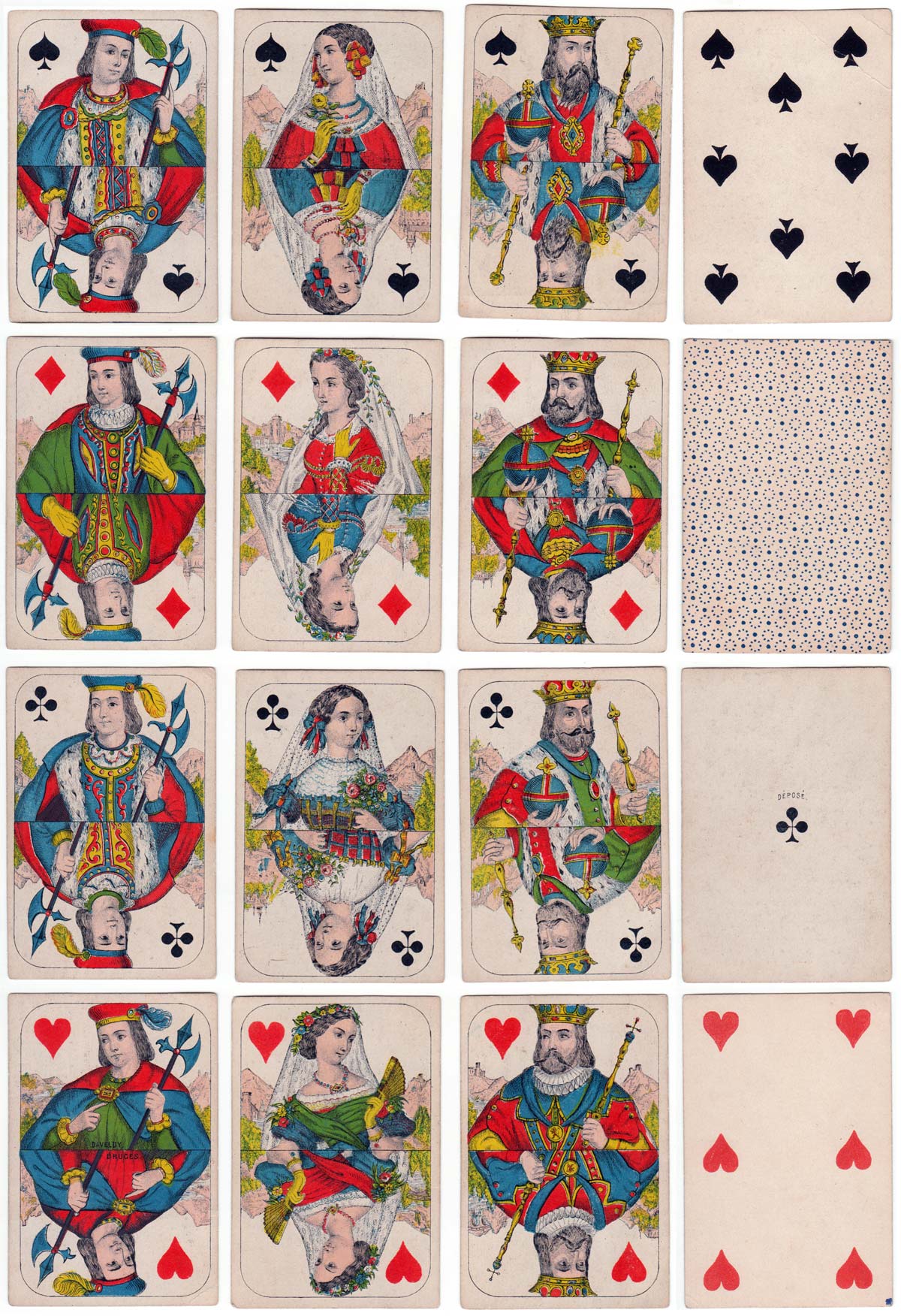 Above: fantasy double-ended designs by Daveluy, Bruges, c.1868. Traditional ideals of workmanship with different colouring at each end. Also known with scenic aces (click image to see more).