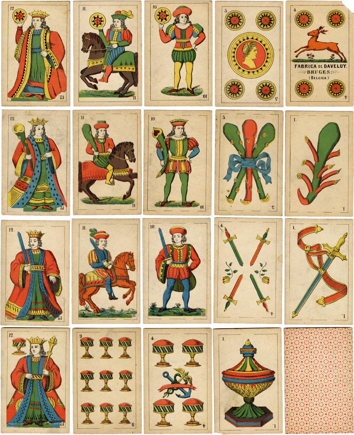 Many of Daveluy's playing cards have historical connotations with reference to the history of the Southern Netherlands, and show figures with a landscape background. Where the Turnhout manufacturers borrowed from French and Continental patterns and addressed the wider world, Daveluy addressed Belgium of the 1830s. However, many of his fantasy playing card designs influenced the output of other manufacturers who imitated his style.