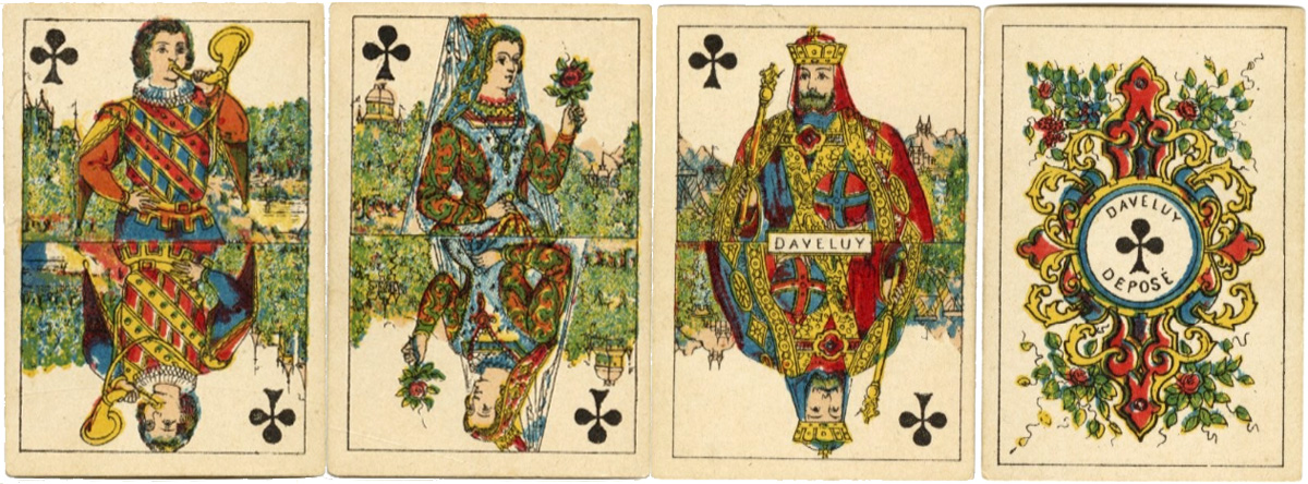 Daveluy produced card games between c.1840 and 1890. Many of his playing cards are in neo-medieval style with landscape backgrounds.