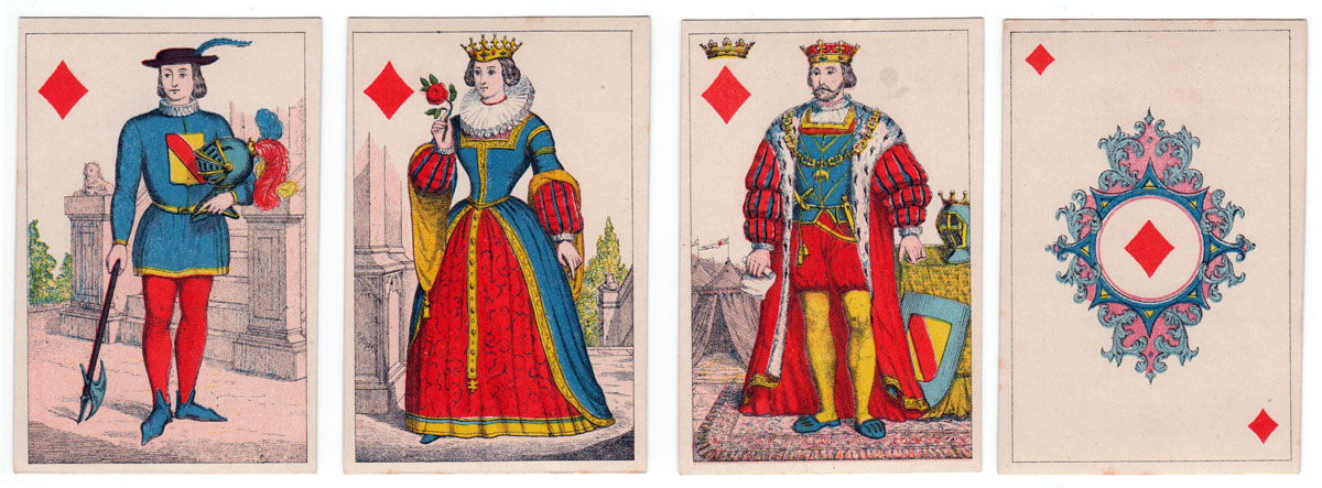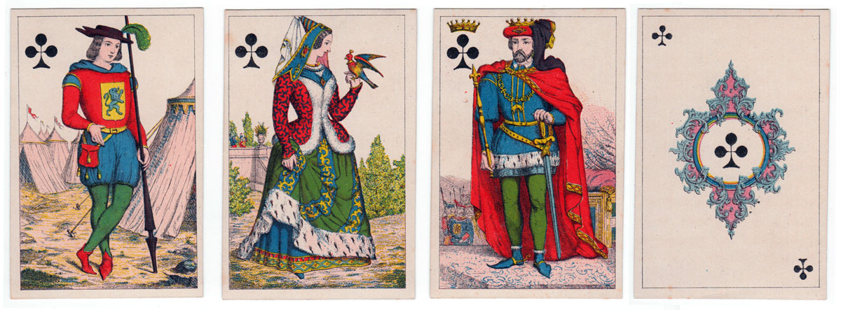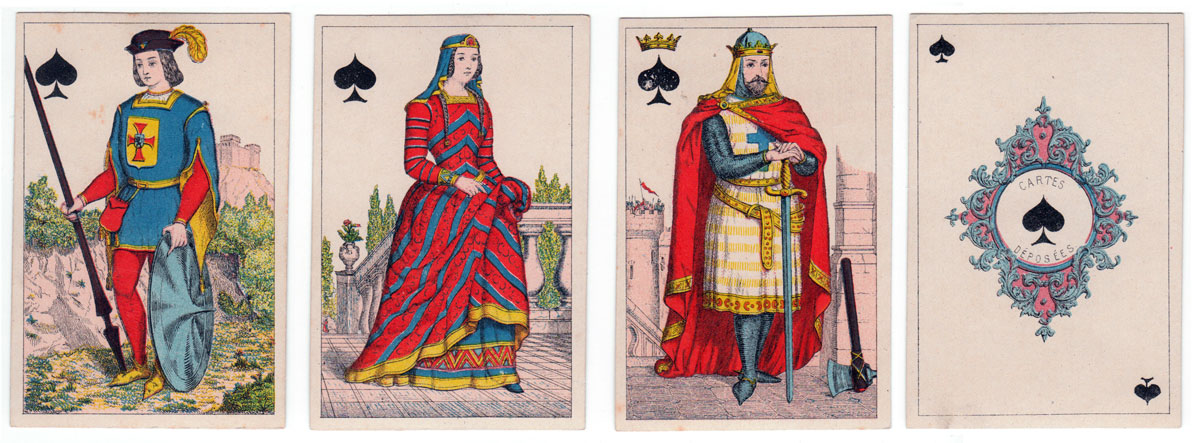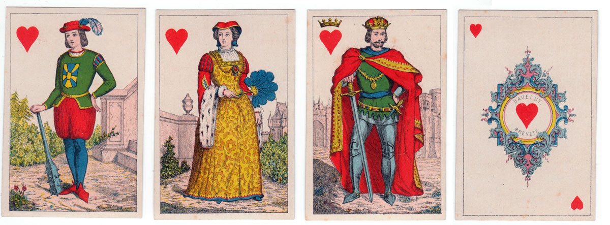 Evoking the time of the First Crusade, with the honour, adventure and traditional religious order associated with those days, this is probably one of Daveluy's earliest packs. The background scenery shows camps of tents or castle gardens. Some editions have gold borders with named court cards. The four Kings are: K♣ Philippe le Bon; K♠ Godefroid de Bouillon; K♦ François Premier; K♥ Baudoin de Constantinople. The Queens are: Q♣ Marie de Bourgogne; Q♠ Richilde; Q♦ L'infante Isabelle; Q♥ Marguerite d'Autriche.